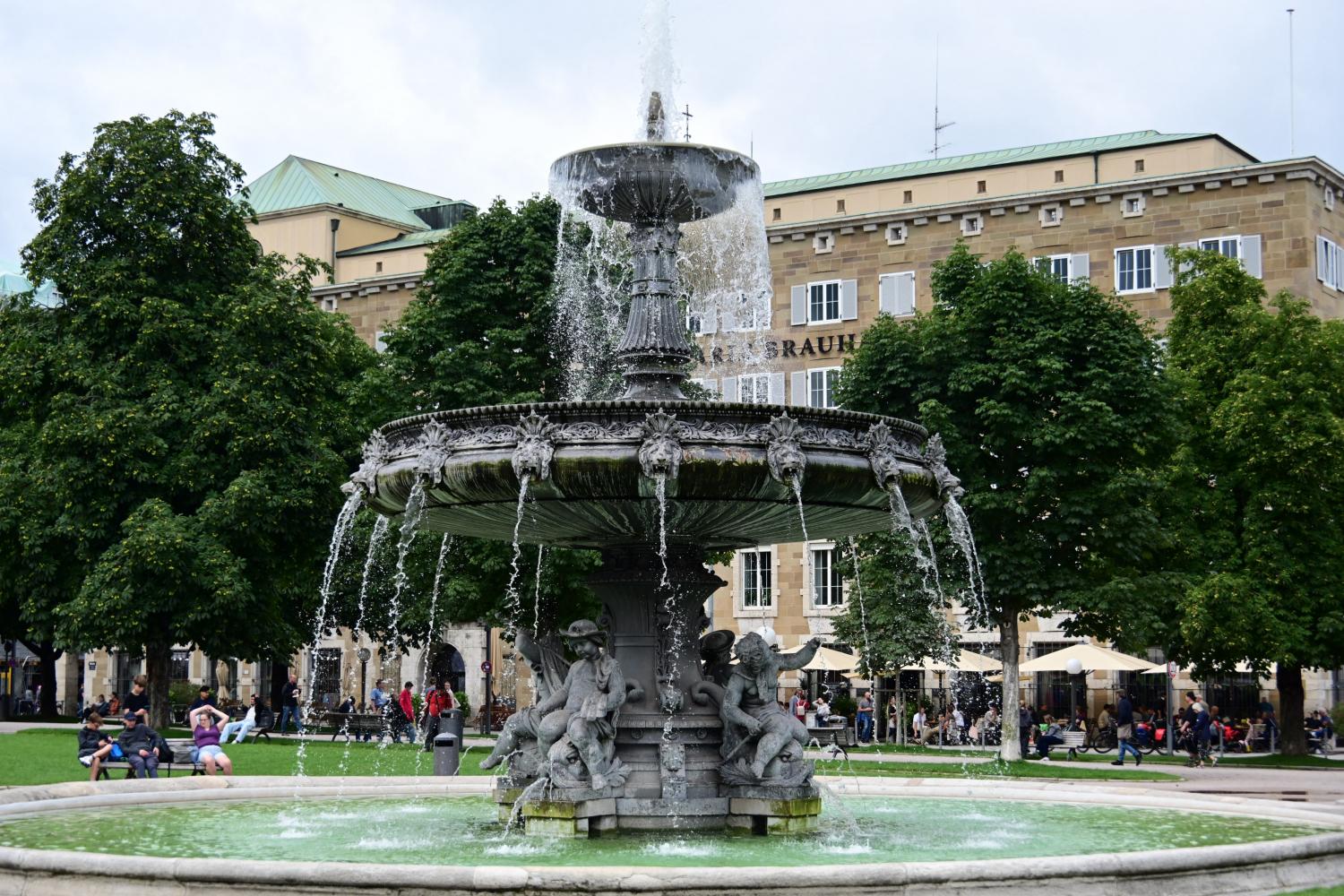 正前方的国王大厦,是古典主义风格的建筑,由符腾堡国王威廉一世于1856年下令修建,正面有34根柱子组成的135米长柱廊,气势壮观,可惜二战时受损严重,2006年重建后,成为一处高档的购物中心。