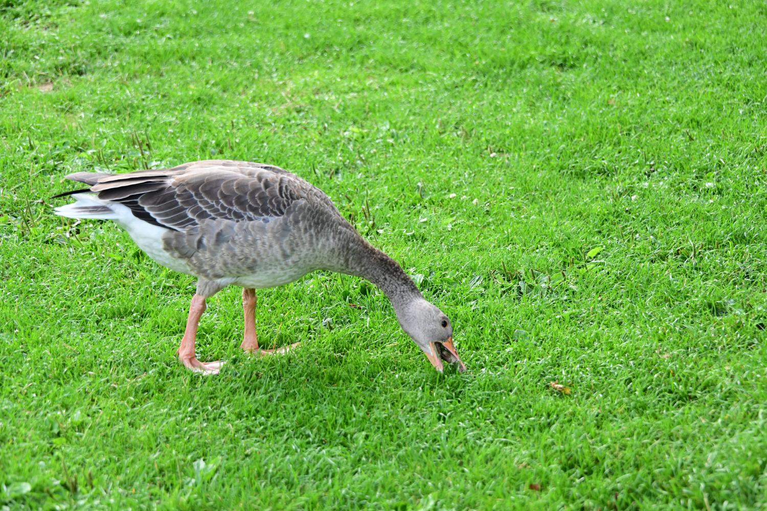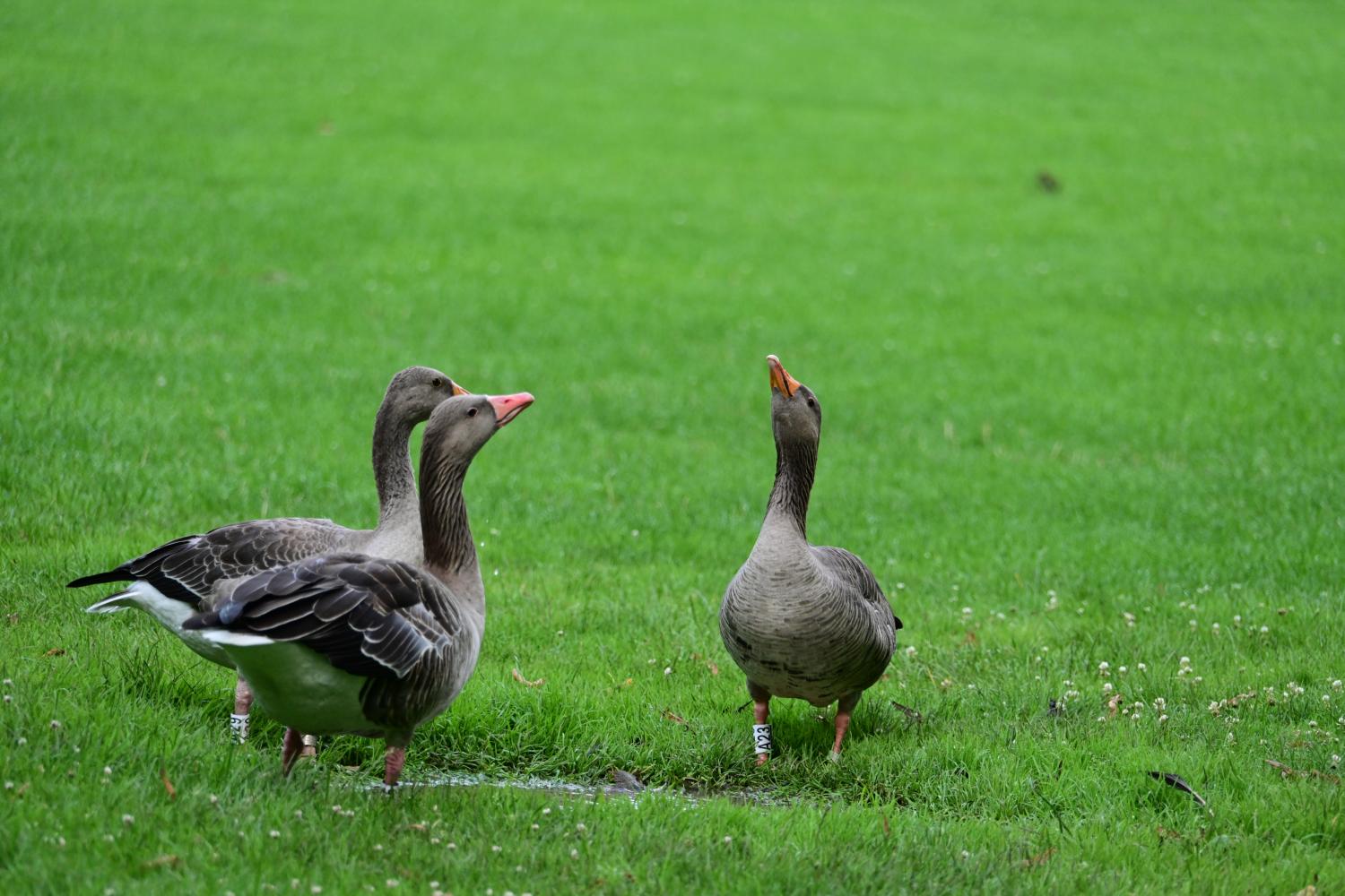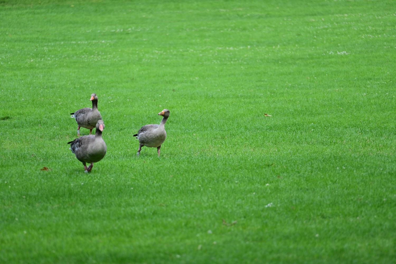 没看到河,倒是看到一大片绿地。绿地上同样骄傲的,还有一群灰雁,正昂首阔步靠过来,大概也是吃得太饱了,需要消食吧,哈哈~~~