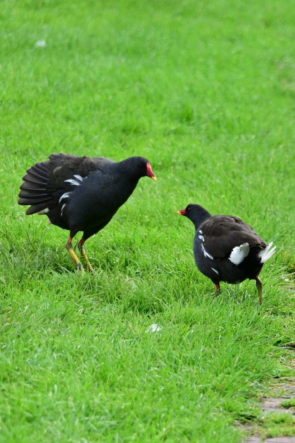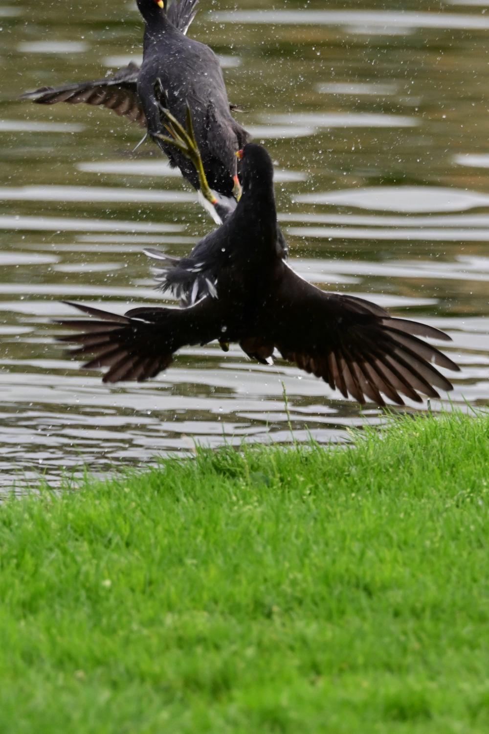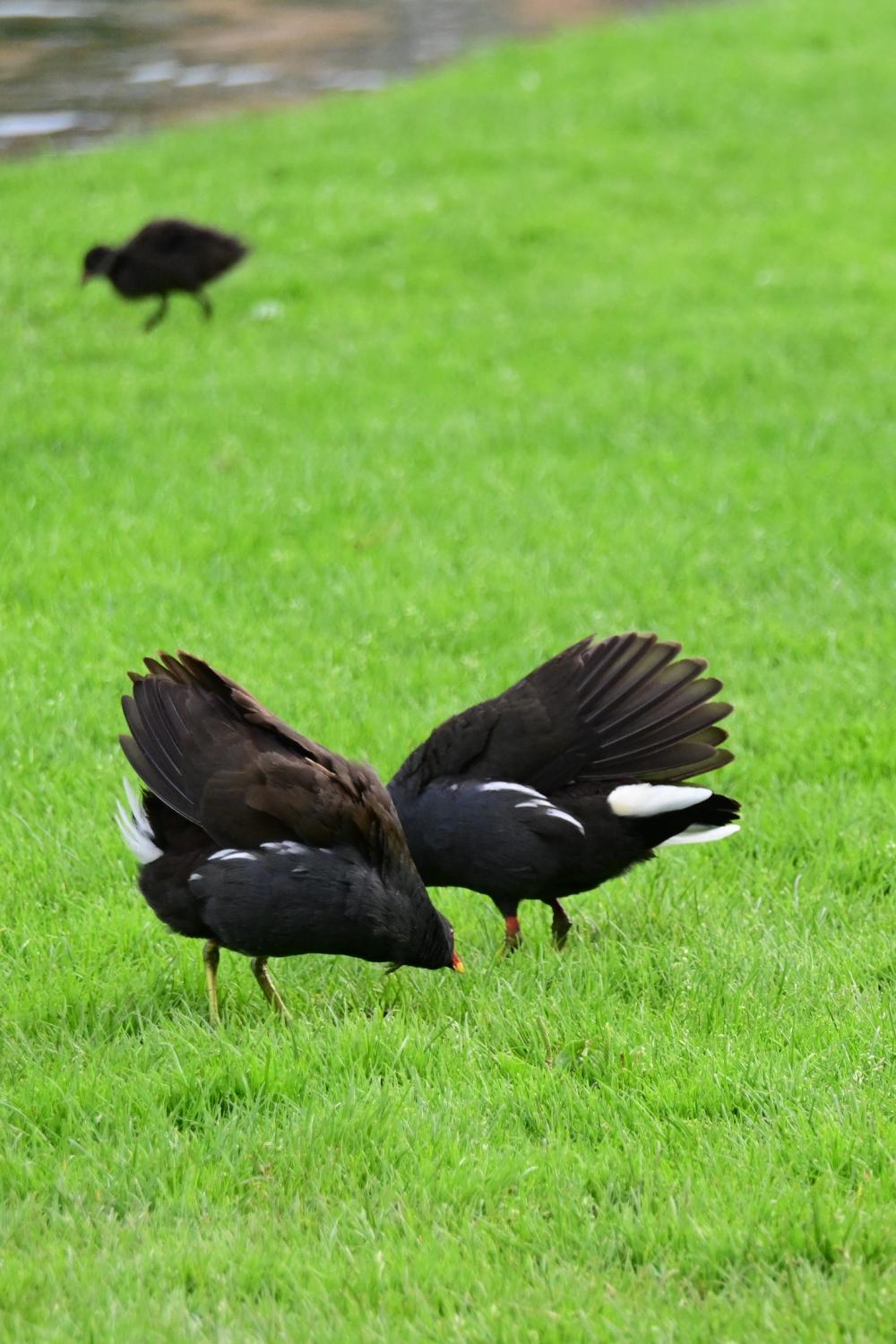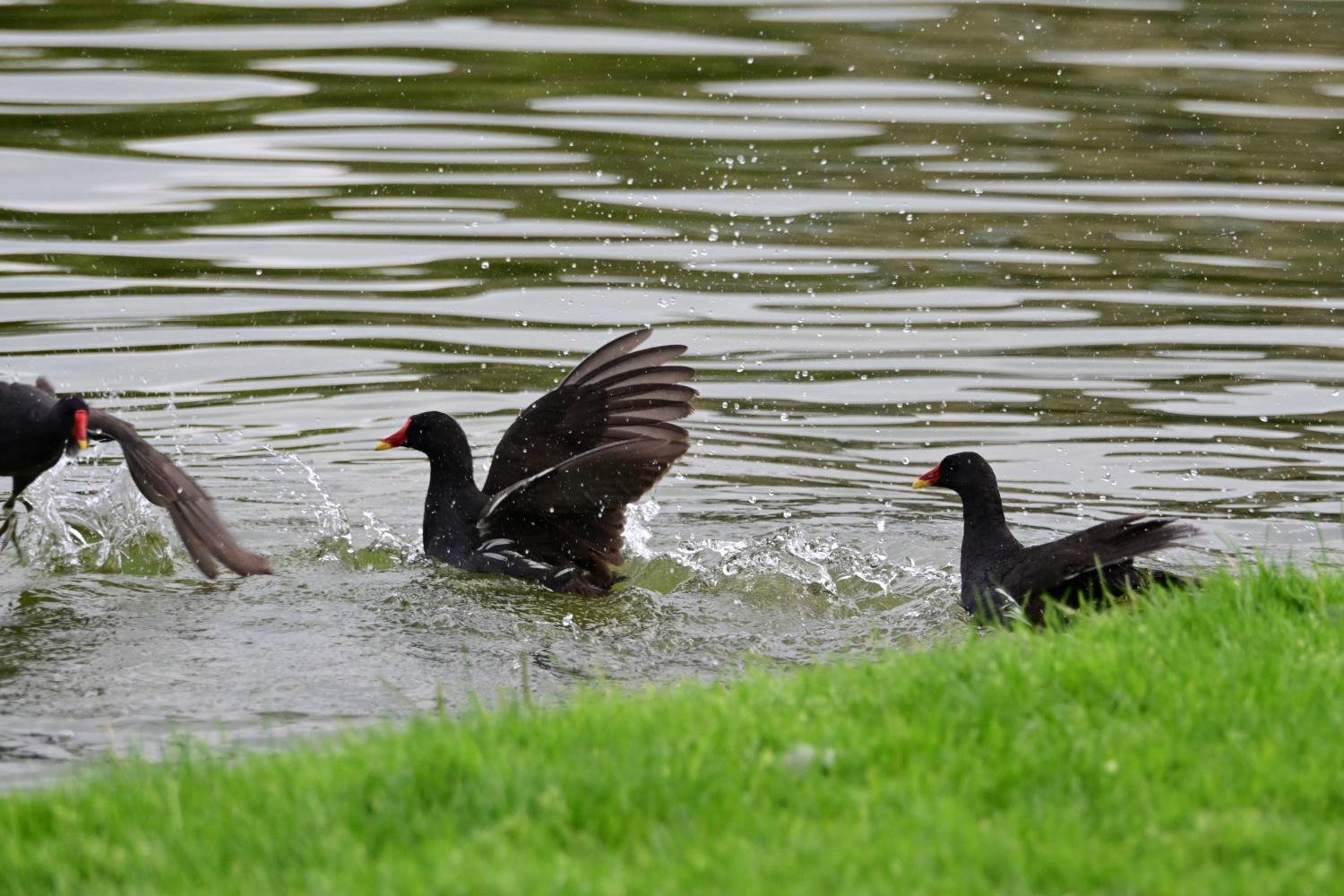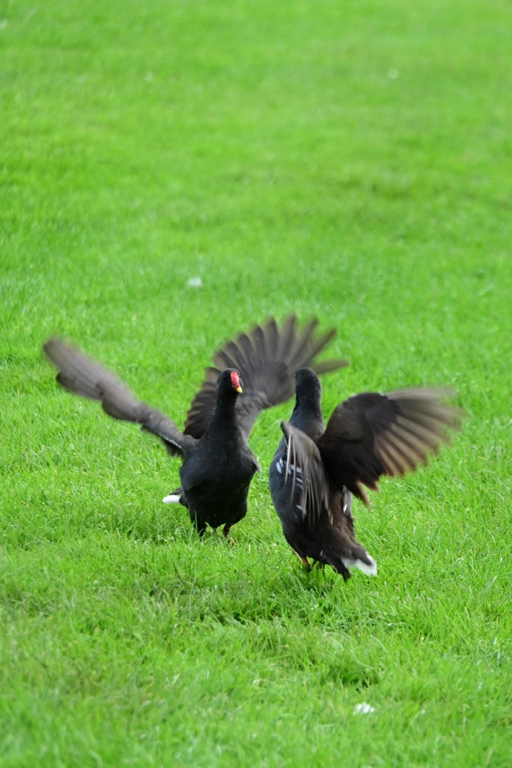 大靠近水池的位置,还有几只黑水鸡,体量并不大,却很好斗,翅膀一直处于半张的状态。