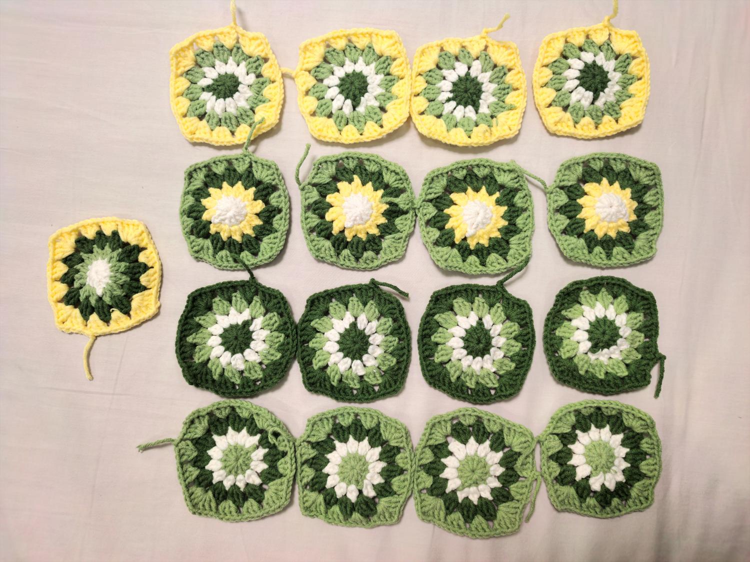 与山茶花搭配的祖母格花片,一共需要17个,分别有五种配色方案。