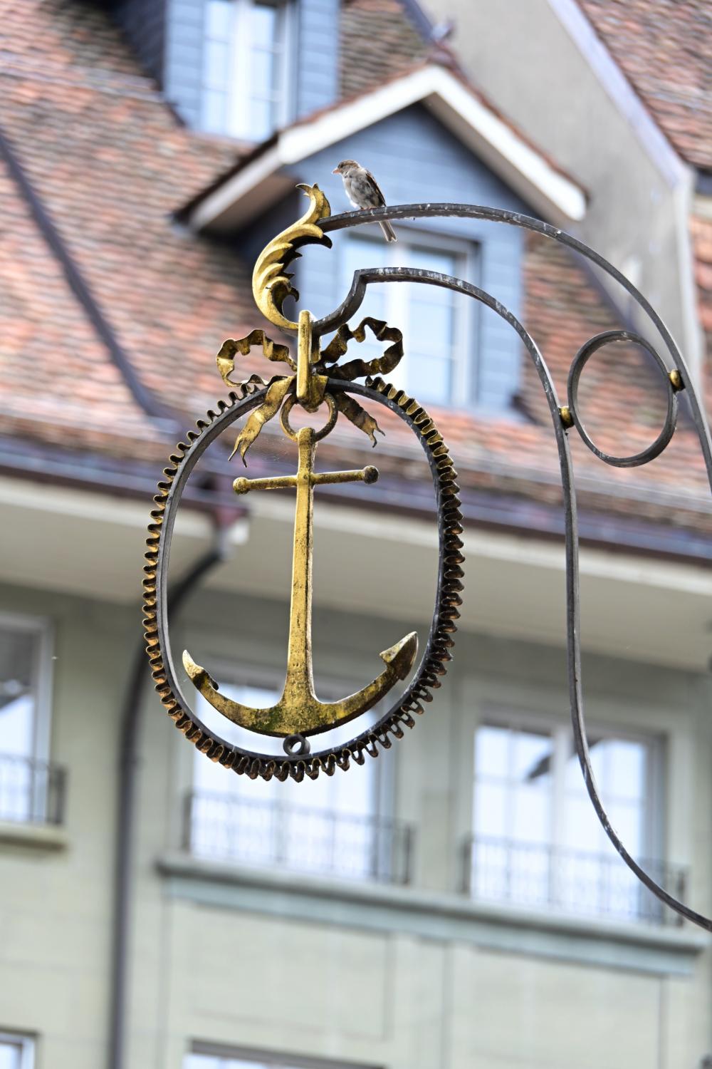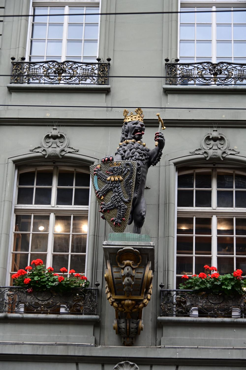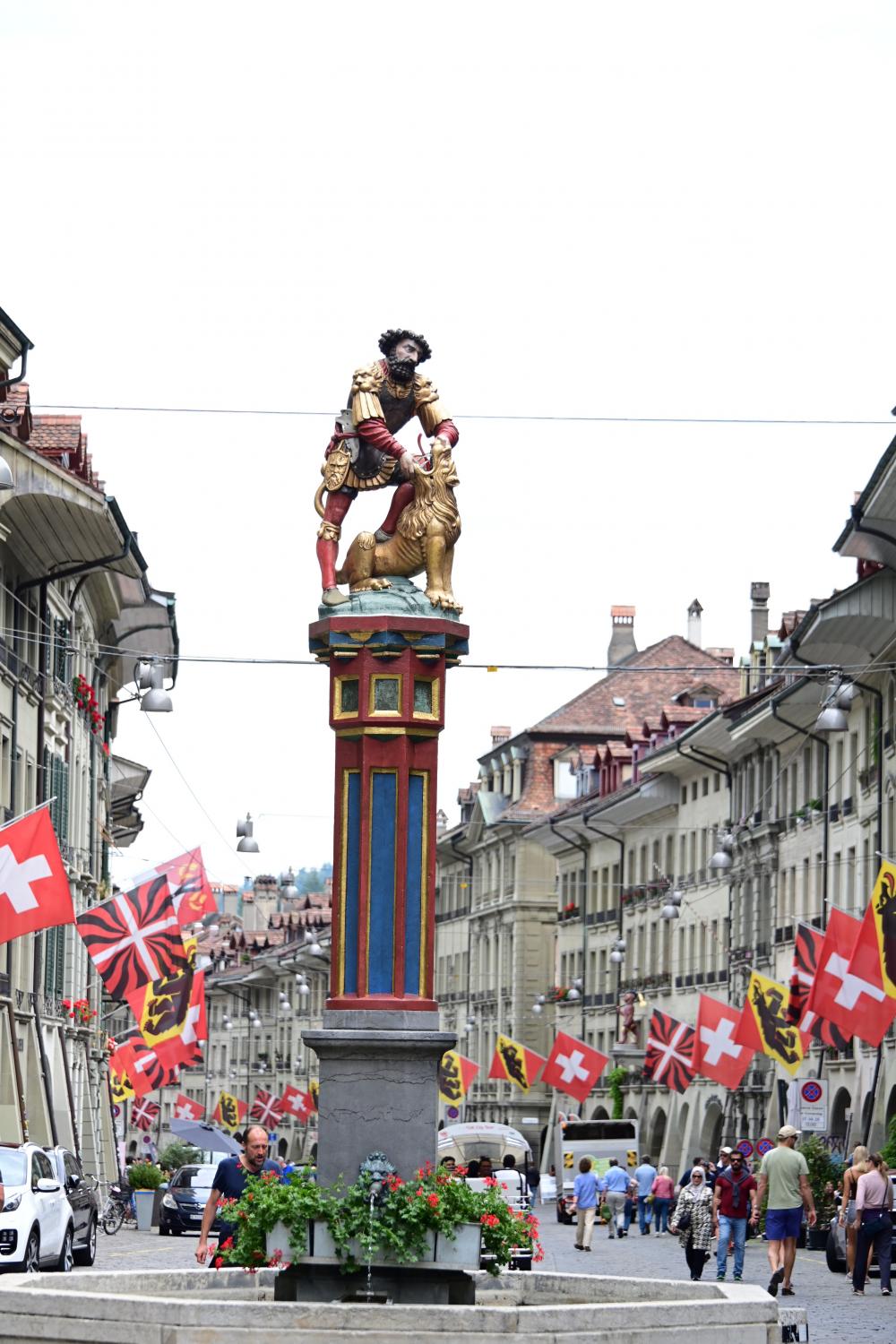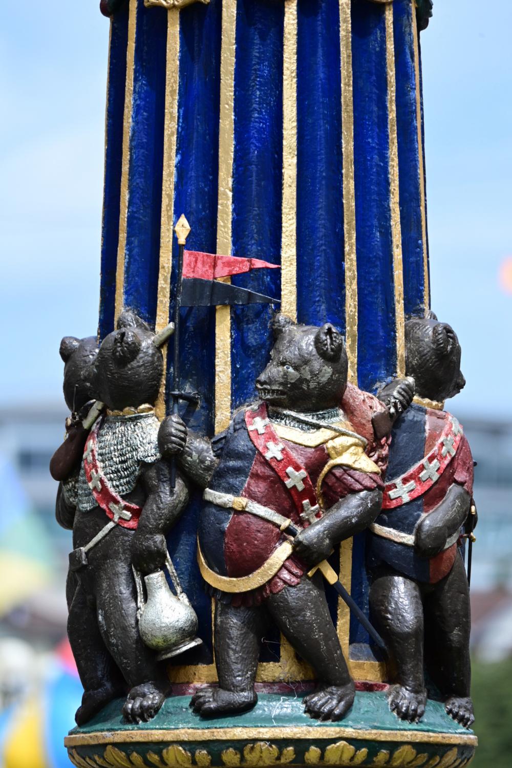 熊的形象渗透到伯尔尼城市的各个层面。市徽最初为白底黑熊,1289年斯科斯哈尔德战役后,传说市旗被鲜血染红,所以改为红底金带,黑熊熊爪、舌头和生殖器为红色,象征勇气与生命力。市徽中的对角线金带在1375年的文献中已有记载,最终定型于14世纪。1535年建造的策林根喷泉位于克拉姆街,雕塑为身披铠甲的熊,脚边依偎着幼熊,纪念城市创始人贝特霍尔德五世,铠甲和盾牌上饰有扎灵根家族的狮子纹章,象征权力与守护。稍后会看到这座喷泉。