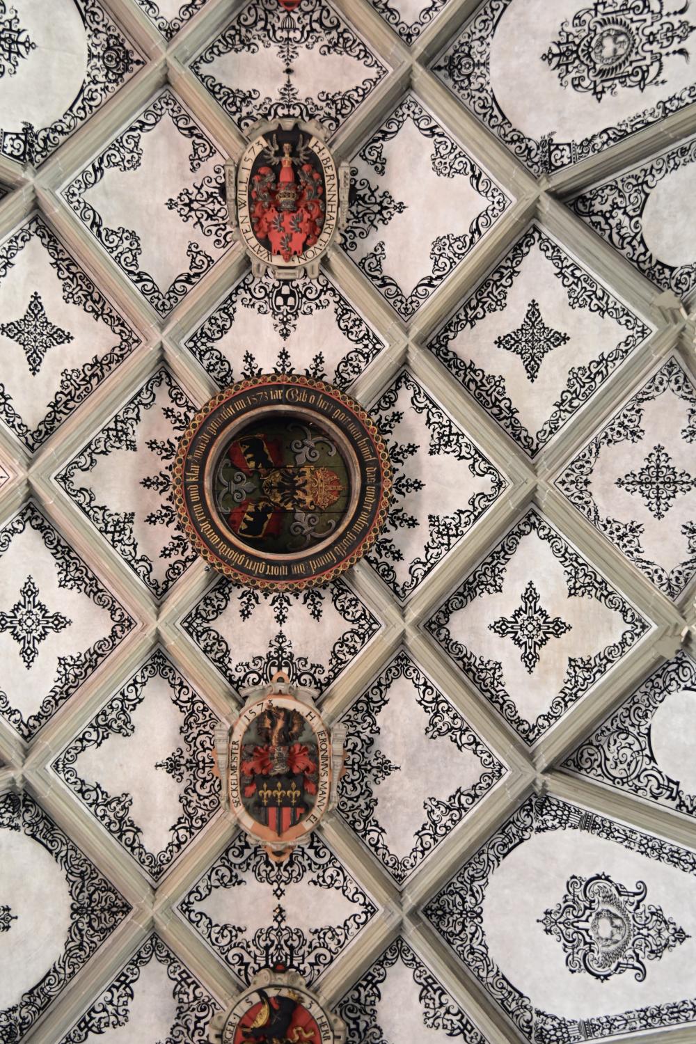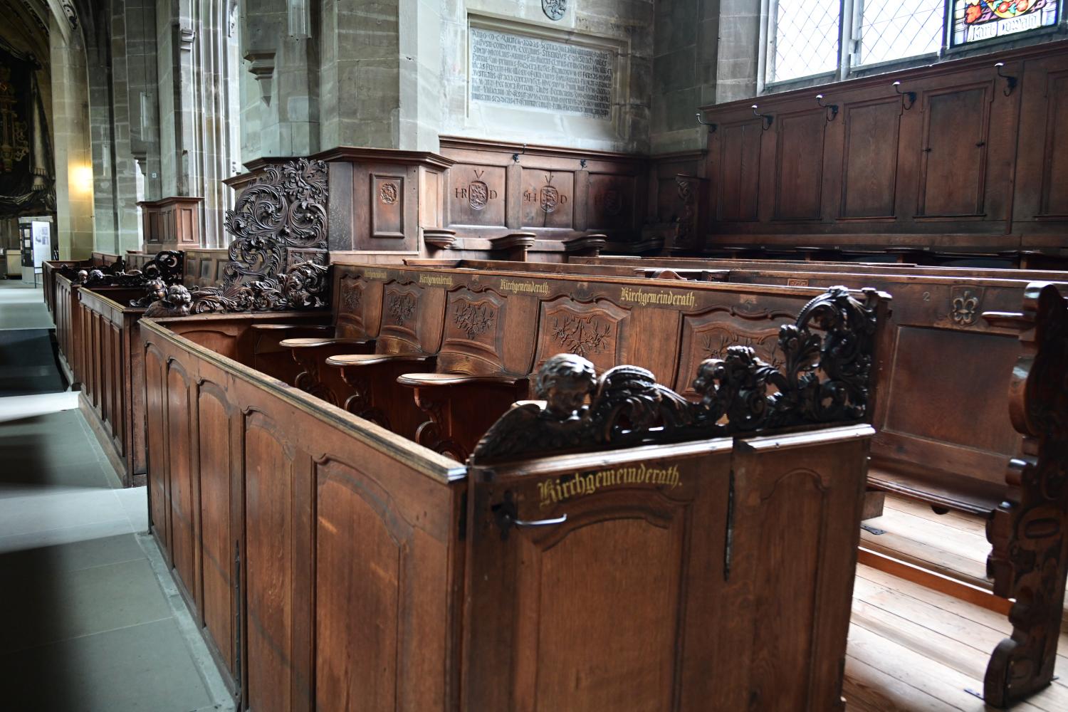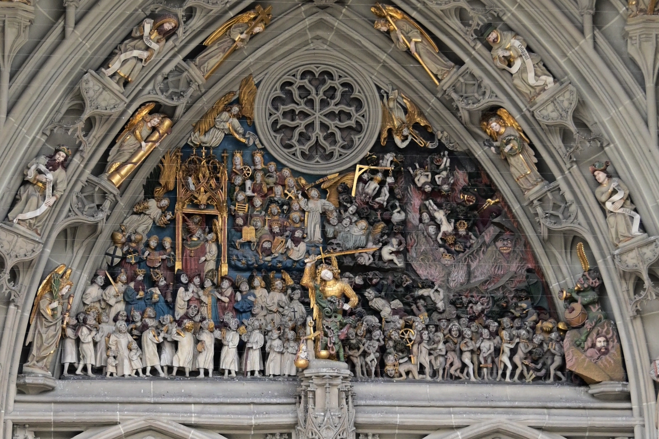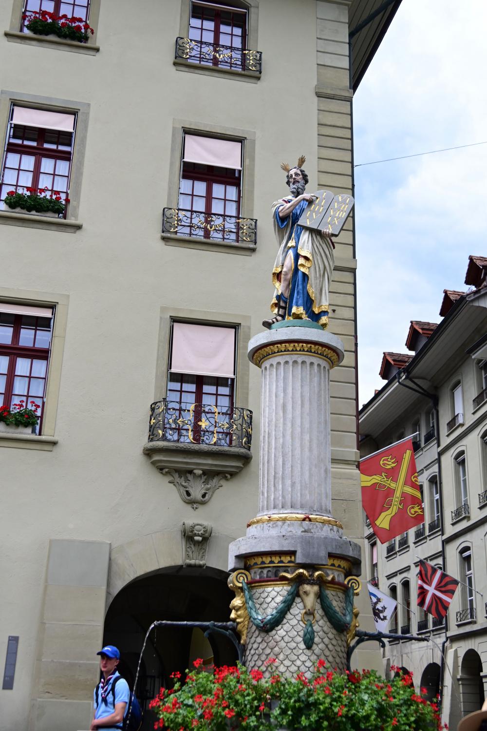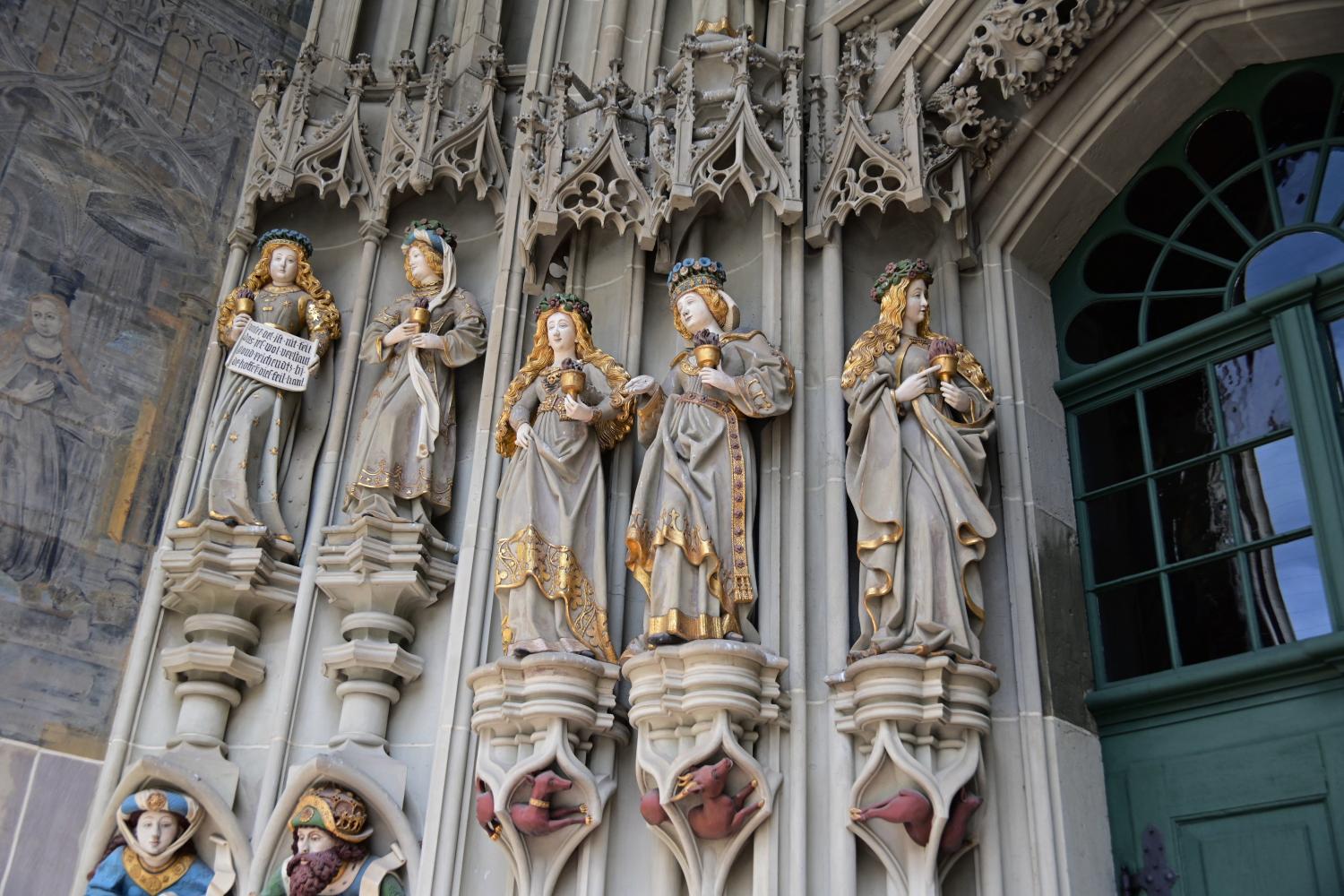 熊的形象渗透到伯尔尼城市的各个层面。市徽最初为白底黑熊,1289年斯科斯哈尔德战役后,传说市旗被鲜血染红,所以改为红底金带,黑熊熊爪、舌头和生殖器为红色,象征勇气与生命力。市徽中的对角线金带在1375年的文献中已有记载,最终定型于14世纪。1535年建造的策林根喷泉位于克拉姆街,雕塑为身披铠甲的熊,脚边依偎着幼熊,纪念城市创始人贝特霍尔德五世,铠甲和盾牌上饰有扎灵根家族的狮子纹章,象征权力与守护。稍后会看到这座喷泉。