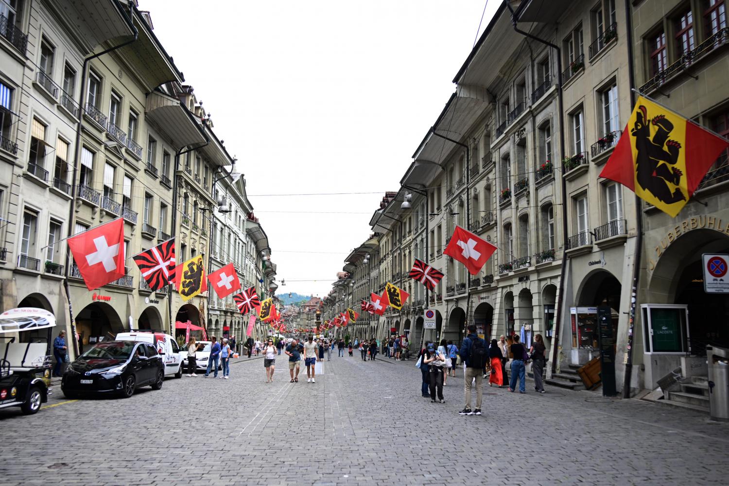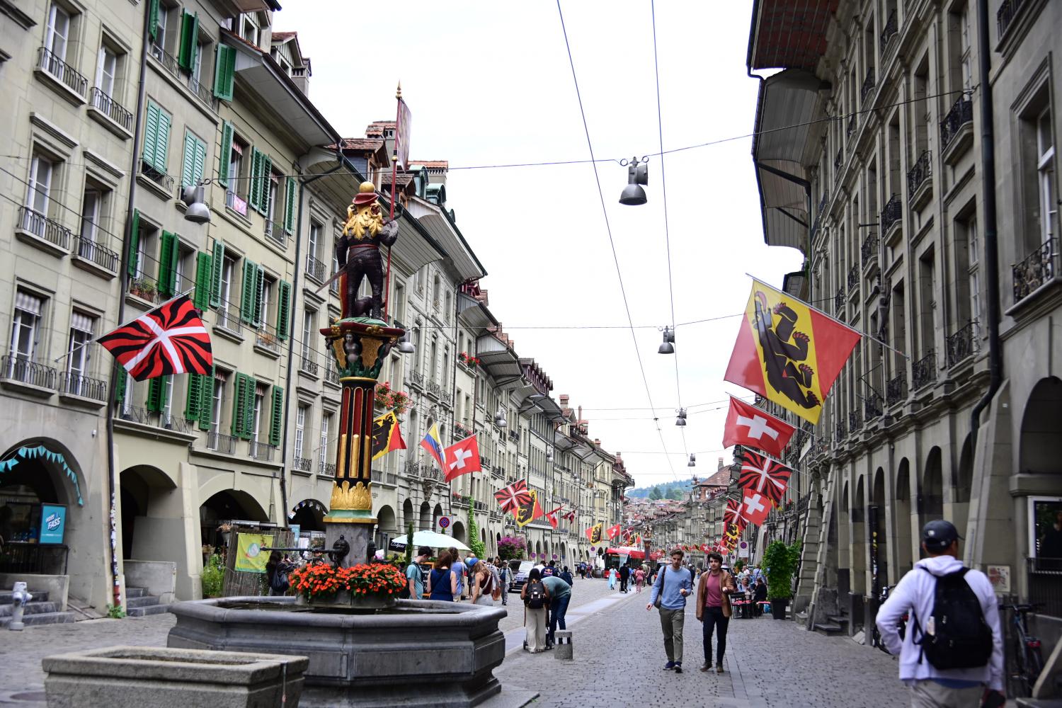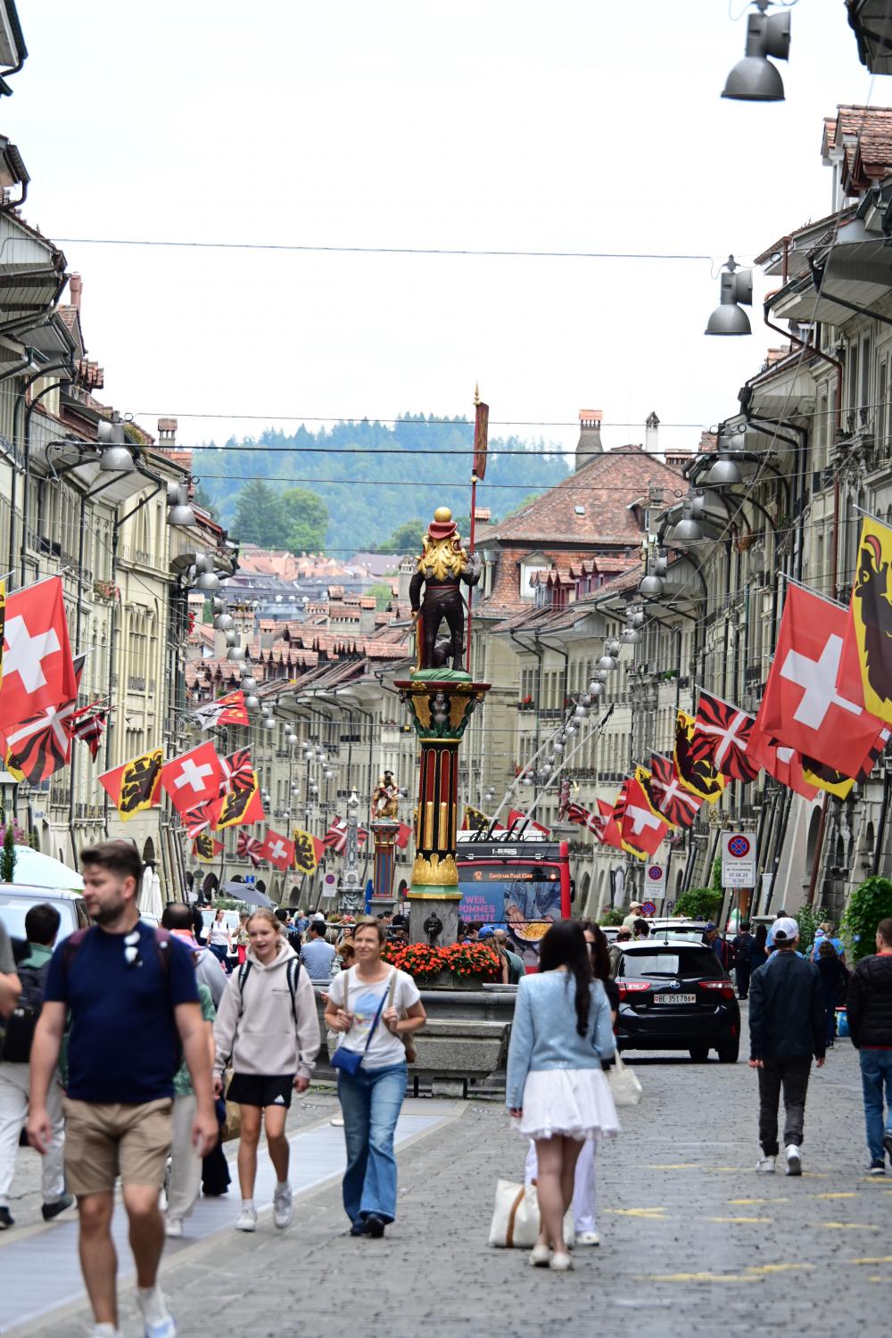 旗子很显眼,主要有两种,一种是红底白十字图案的瑞士联邦国旗,另一种是伯尔尼的城市旗帜,带有黑色熊形象,反映的正是伯尔尼与熊的深厚历史渊源,另外一种红底米字图案的,大概是瑞士伯尔尼州旗。