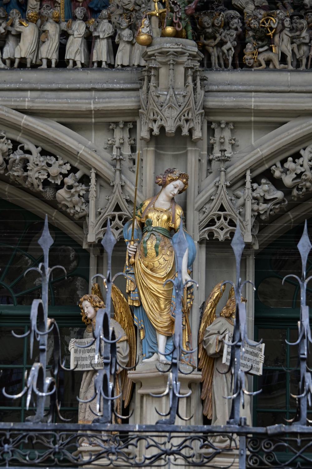 喷泉核心的正义女神,融合了文艺复兴人文主义与宗教思想,双眼蒙布,象征司法中立,不受外界干扰,,右手持正义之剑,代表法律的制裁权力,,左手托天平,象征公平裁决;服饰为仿古风格,蓝袍外覆装饰性金色盔甲,尽显庄严神圣。
