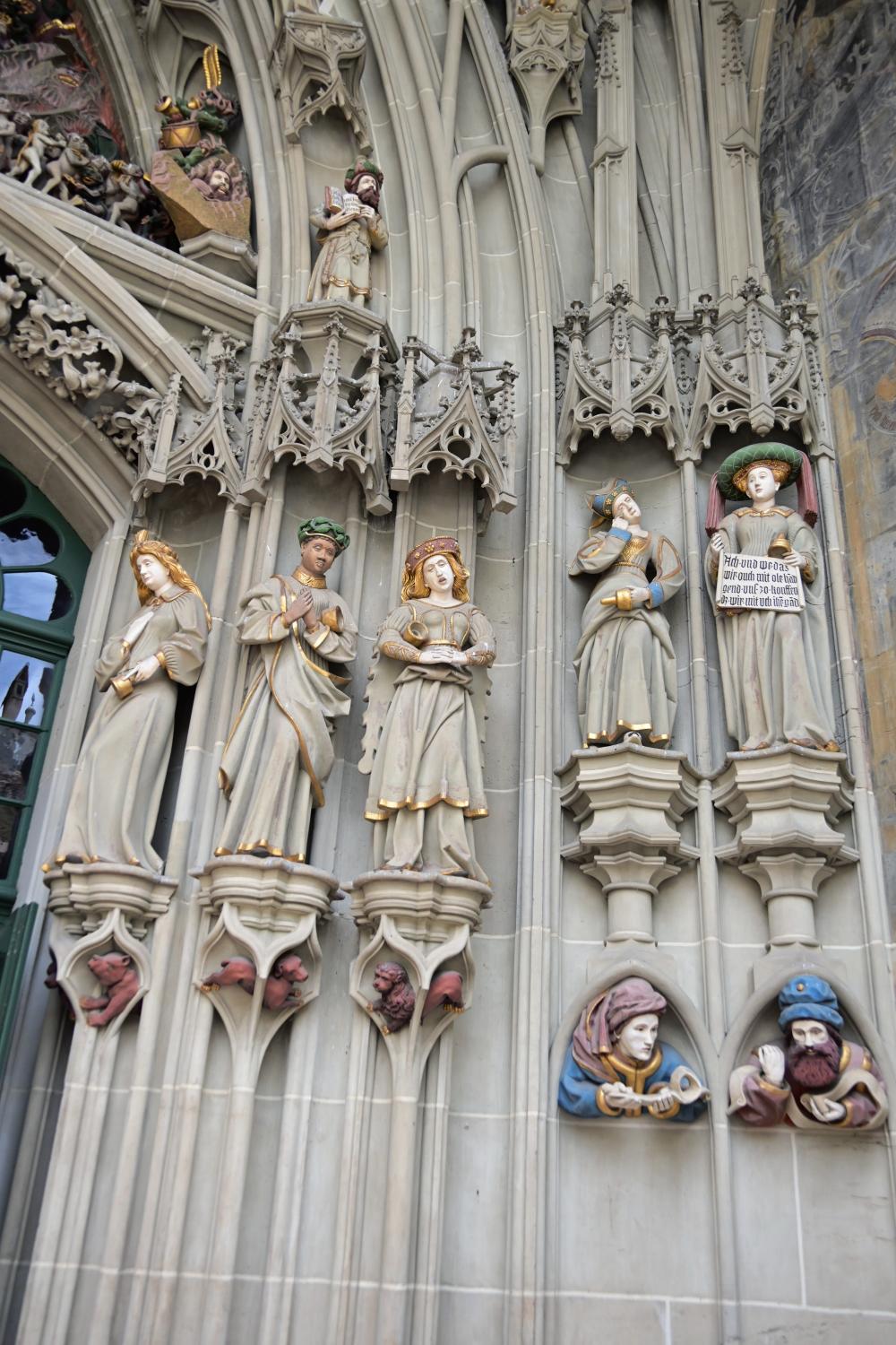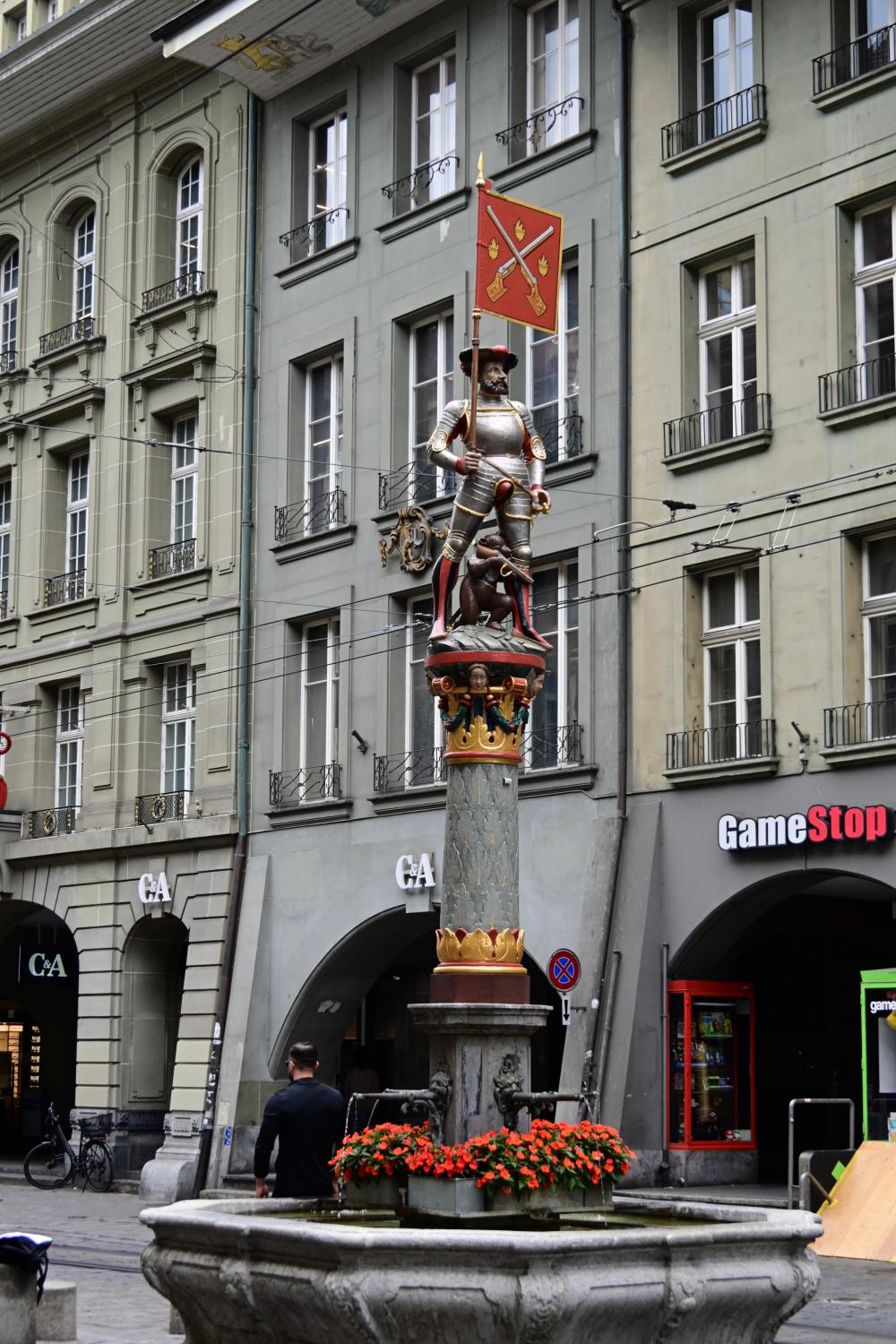 紧邻钟楼的策林根喷泉建于1535年,纪念伯尔尼的建城者扎灵根公爵贝特霍尔德五世。雕塑中的公爵身着铠甲,手持长矛与盾牌,脚下依偎着一只幼熊,呼应了城市名称的起源传说。铠甲上的狮子纹章代表扎灵根家族,而熊的形象则成为伯尔尼永恒的精神符号。