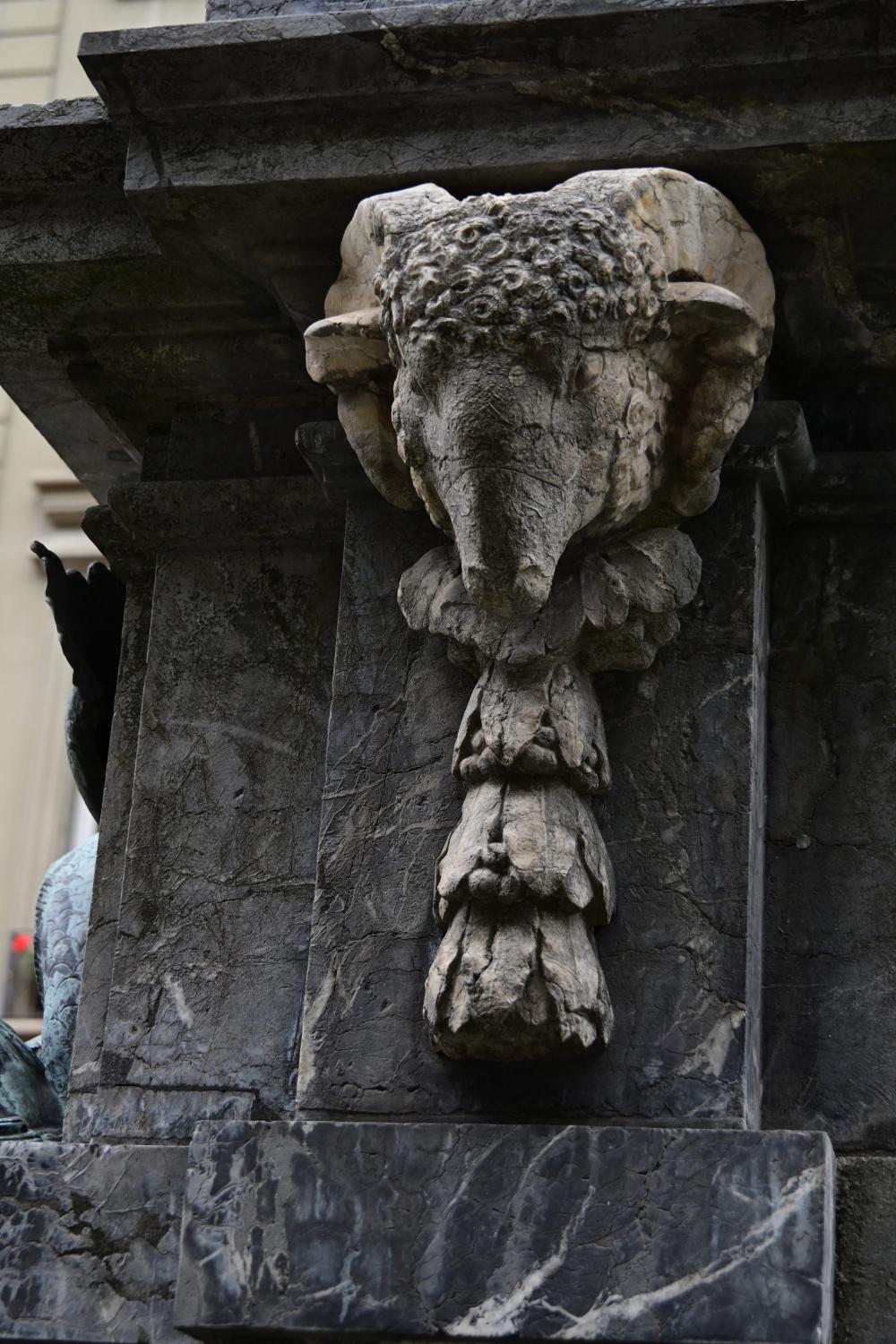 希姆逊单膝跪地,双手掰开狮子的血盆大口,脚下的雄狮挣扎怒吼,肌肉线条与铠甲纹理栩栩如生。喷泉基座的浮雕细节丰富,象征着勇气与力量,是文艺复兴时期雕塑艺术的典范。