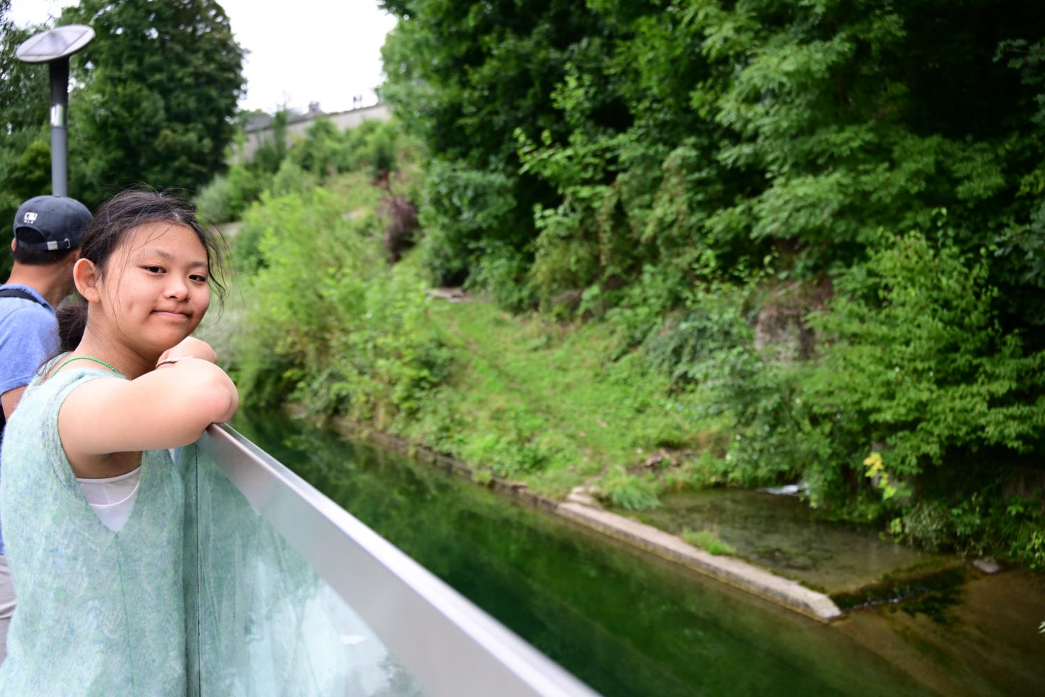 人在尼德路桥上,看下面的阿勒河,特别干净,颜色也特别好看。