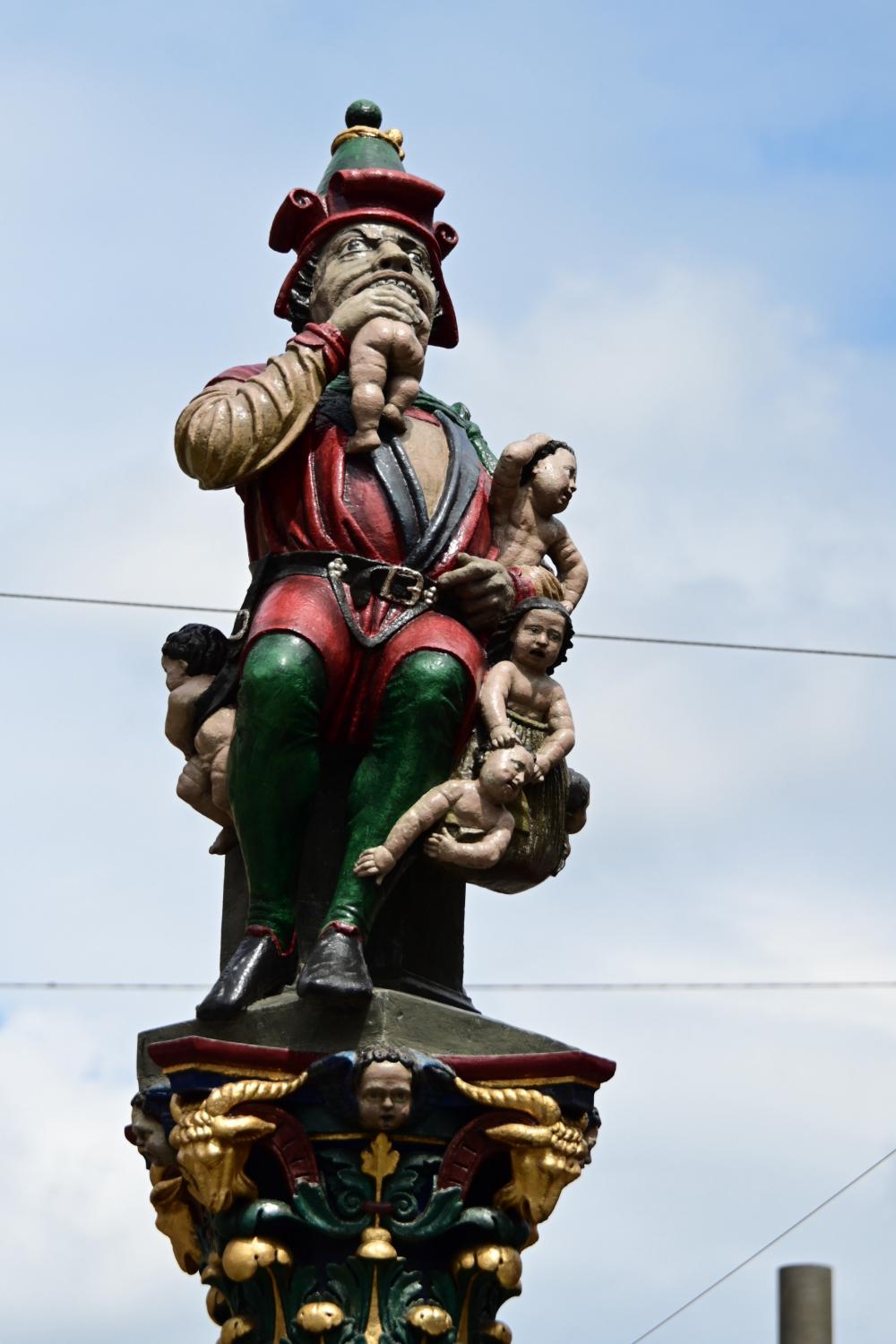 食童魔喷泉位于伯尔尼老城的谷仓广场,始建于1545年,由木质结构改建为石质喷泉。其德语名称 “Kindlifresserbrunnen” 直译为 “吃小孩的喷泉”,雕塑主体是一个面目狰狞的食人魔,正将一个裸体婴儿的头部咬入口中,背包里还装着多个待吞噬的孩童。