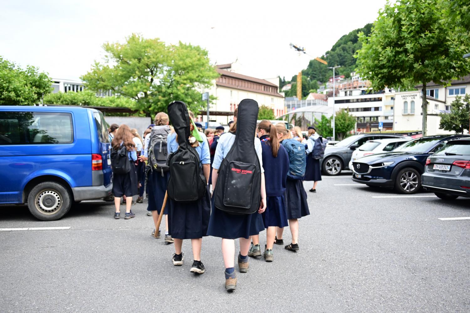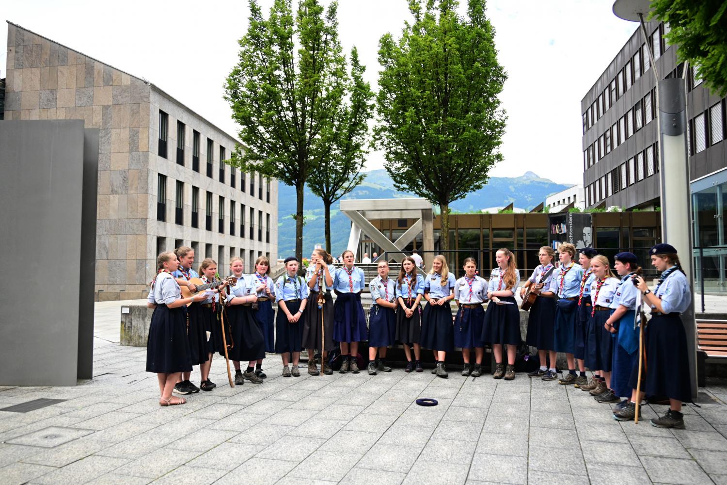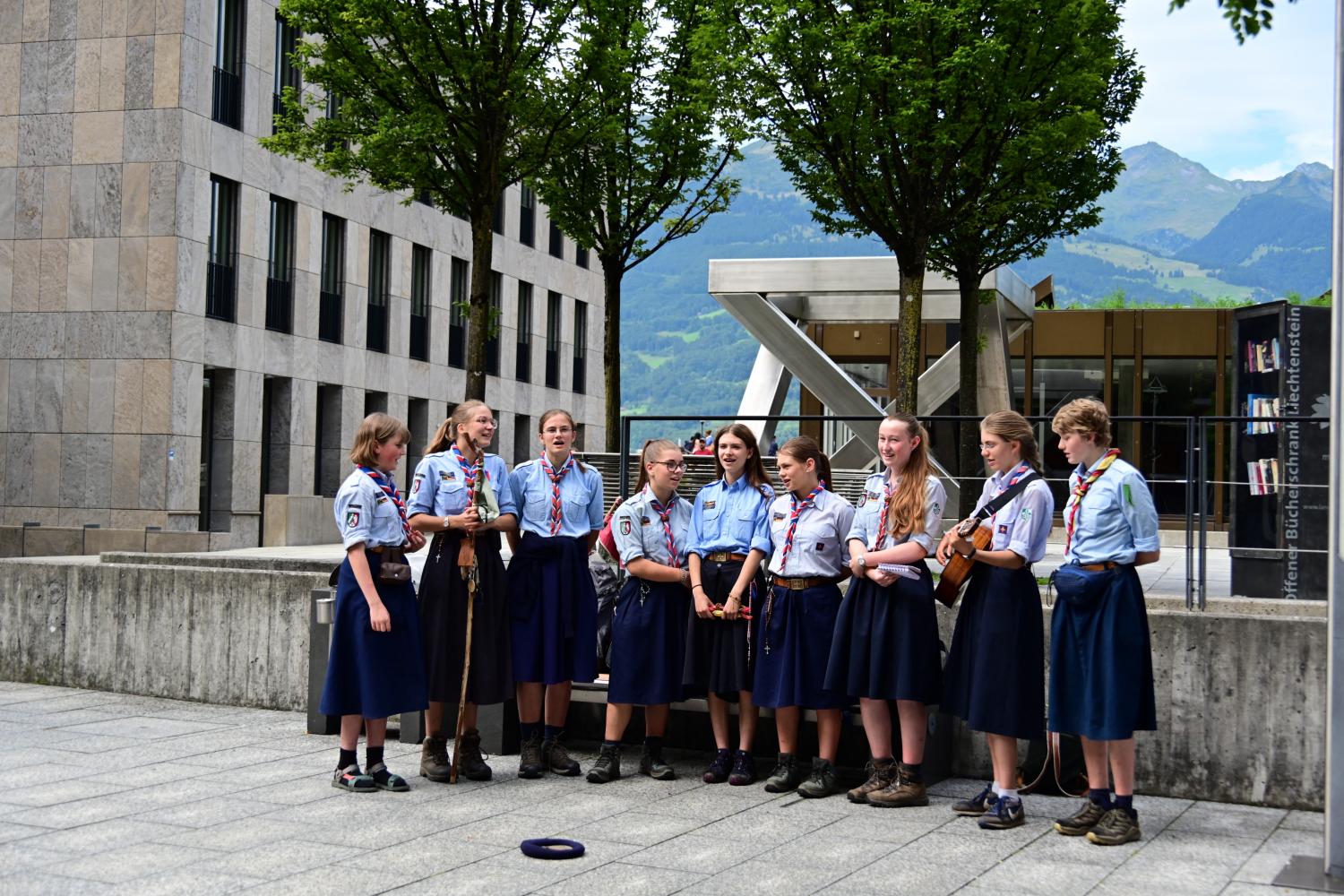 停车场见到的那些孩子,此时正在列队表演,身份大概是列支敦士登的童军组织成员,穿着的制服上带有列支敦士登童军标识。