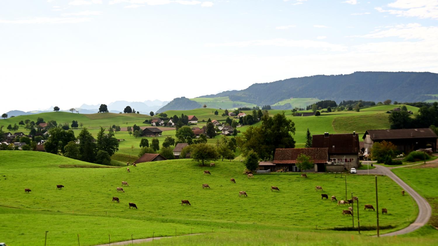 草地都很规整,房屋错落,牛羊点缀其中,悠闲自在。