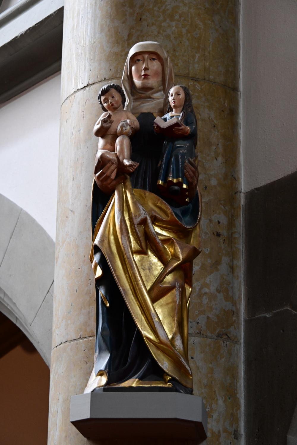 教堂里的宗教木雕圣像,其中之一是圣安妮像,圣安妮是圣母玛利亚的母亲,耶稣的外祖母。对你中的圣安妮身着带金色装饰的深色长袍,怀抱手持地球象征普世王权的幼年耶稣和手持经书象征智慧传承幼年圣母玛利亚,体现天主教对圣母家族谱系的尊崇,是信徒祈求家庭福祉、智慧启迪的精神象征。