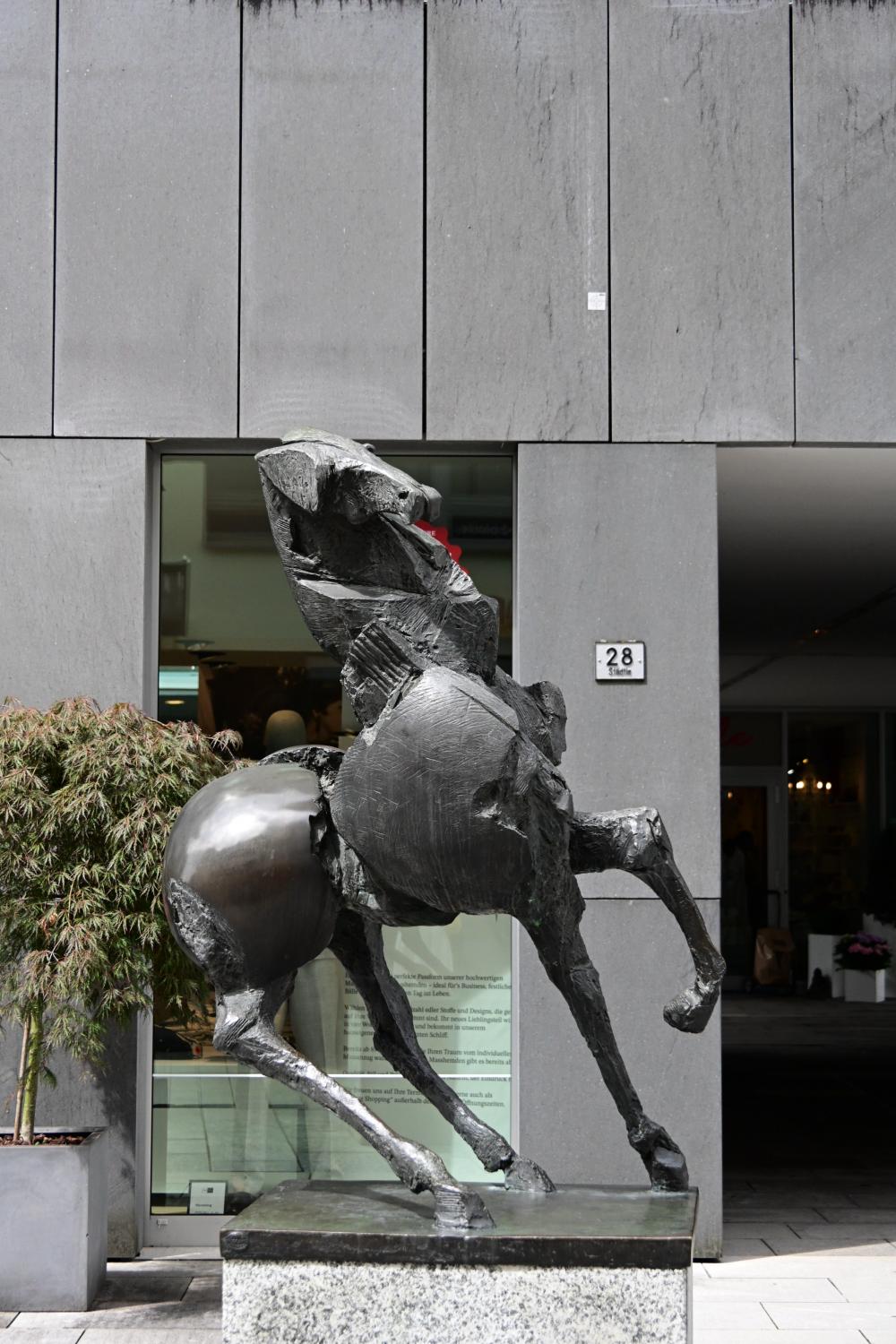雕塑采用抽象手法塑造人马形态,青铜材质的粗犷线条极具现代艺术张力,突破传统写实风格,展现出力量与动感的融合。