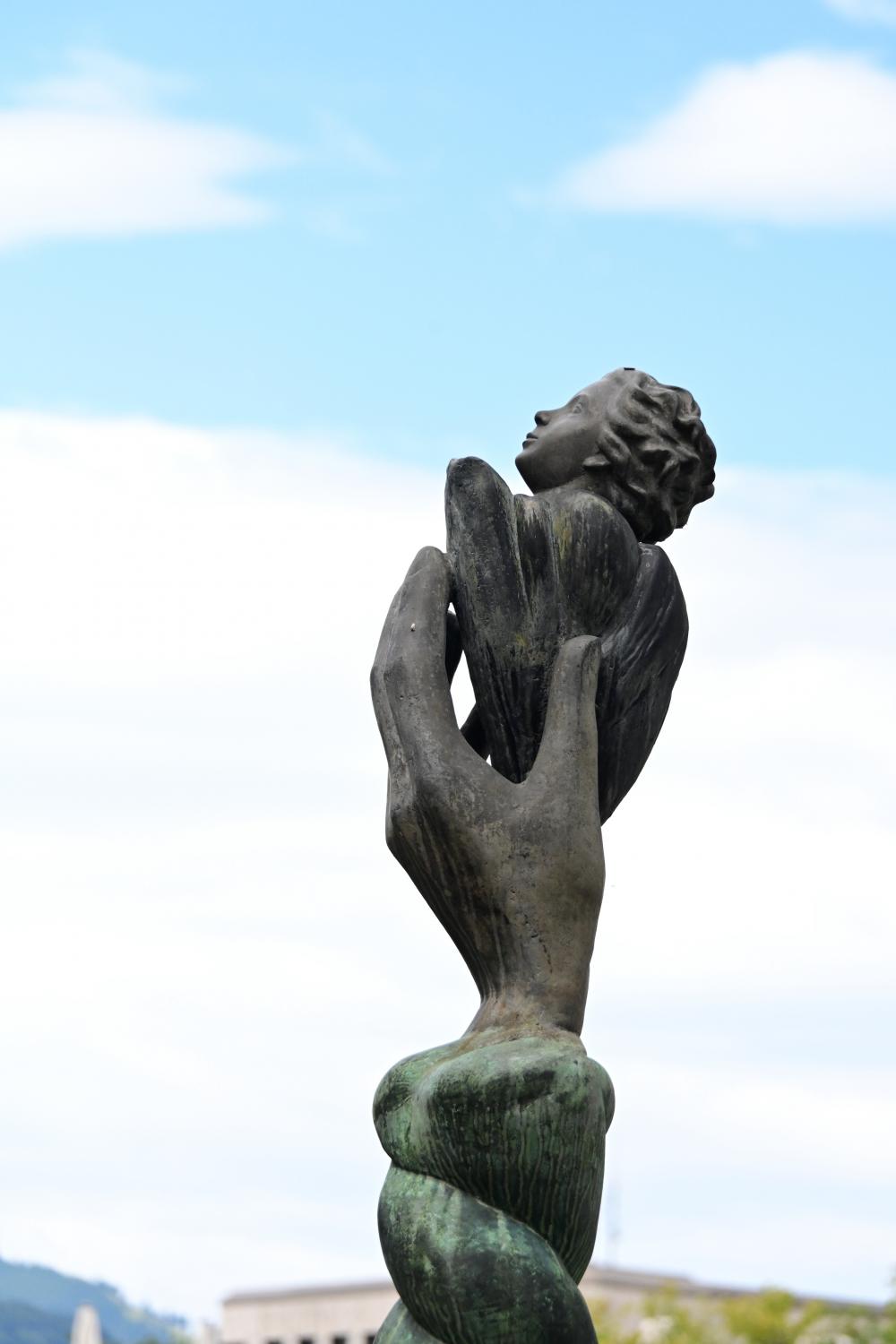 雕塑以螺旋状立柱为主体,顶部由一只大手托举着天使形象,青铜材质呈现出古朴的质感。