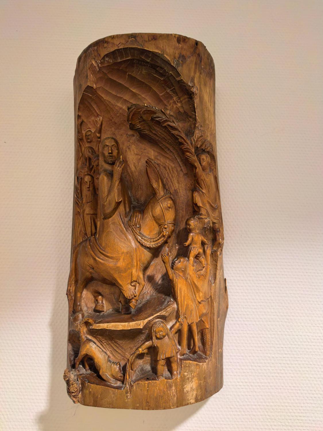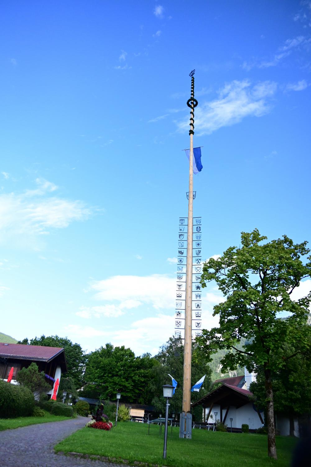 村口,见到德国巴伐利亚地区的传统民俗文化符号五朔节花柱。花柱由高大的原木制成,柱身装饰有代表当地行业、家族徽章或民俗元素的图案,顶部常搭配螺旋装饰、花环及旗帜,色彩与图案极具巴伐利亚民俗风格。
