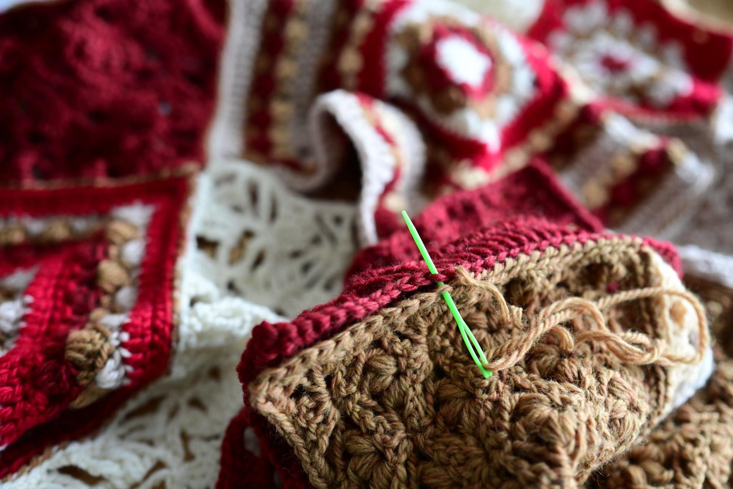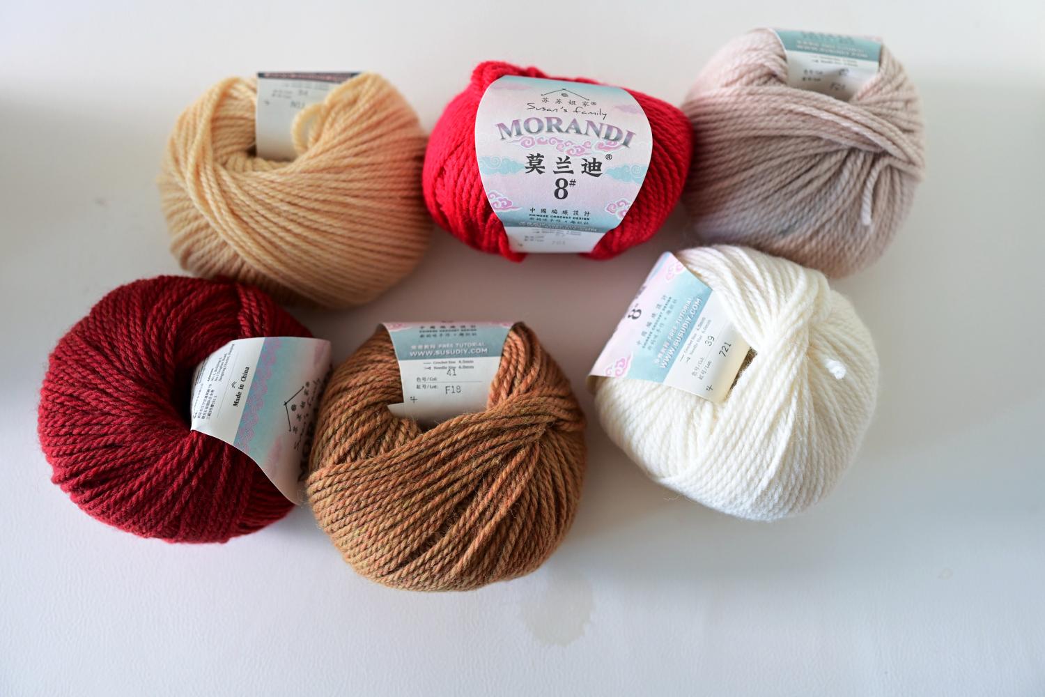 用的是莫兰迪8#线,共用到米白、秋黄、罗马红、中国红、浅卡其、杏仁黄六种线色。线材偏粗,用4.5mm的钩针去完成。