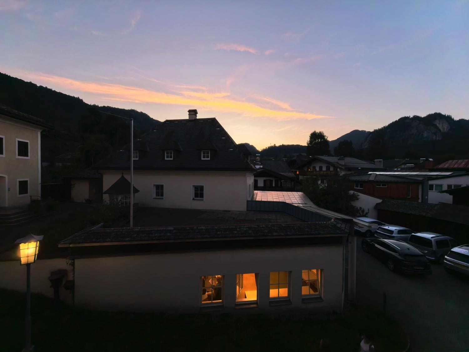 行程的第二十一天,奥地利圣吉尔根镇,酒店露台上的朝霞,伴着灯火,清凉中散发着温暖气息。