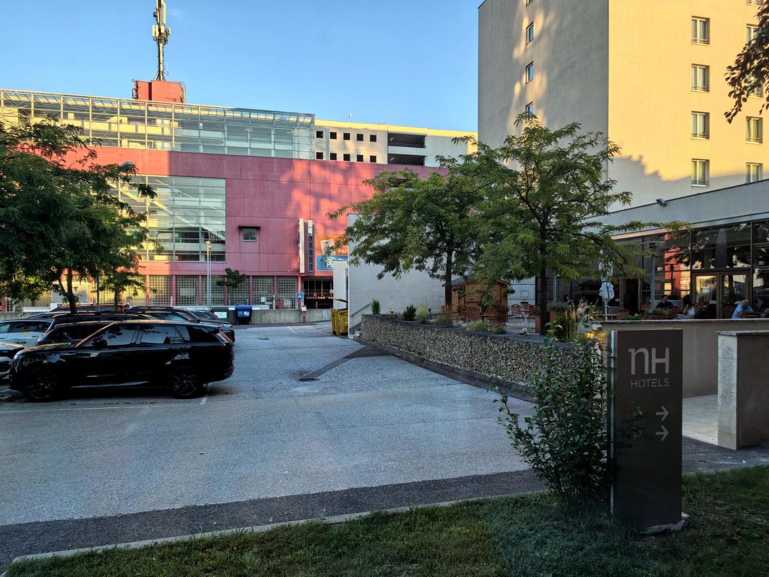 房间在一楼,透过窗子,看到对面的那个红色楼,写着P字的地方,就是还车的车场的入口,没想到这距离是近得不能再近了。