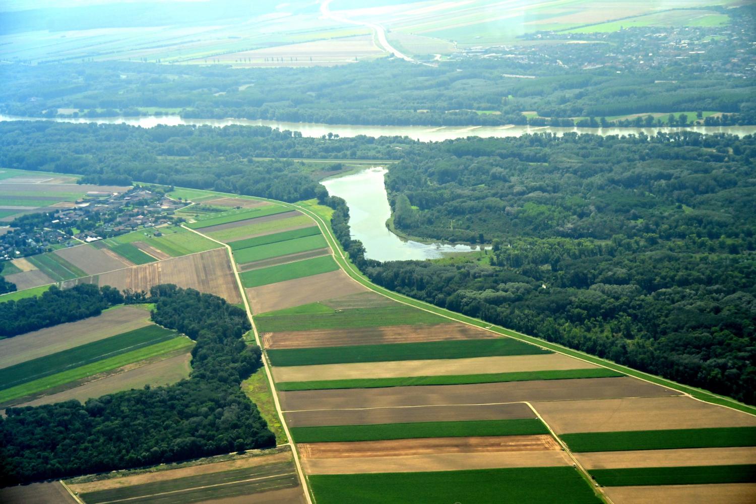 多瑙河如一条蓝绿色的绸带,在平原上舒展蜿蜒。森林浓绿如绒毯,与斑斓的农田色块交错,勾勒出大地的肌理。往抒情里说,这是多瑙河女神的空中私语:农业的诗意、河流的韵律、森林的呼吸,还有城市建筑的典雅,在高空视角下凝成一曲流动的交响,既有田园的悠然,又藏着帝国旧梦的精致,每一道线条都在诉说着维也纳在自然中生长的宜居密码。