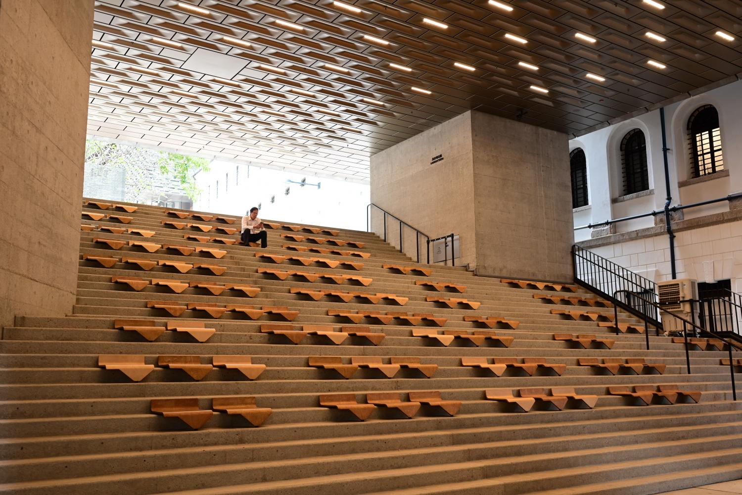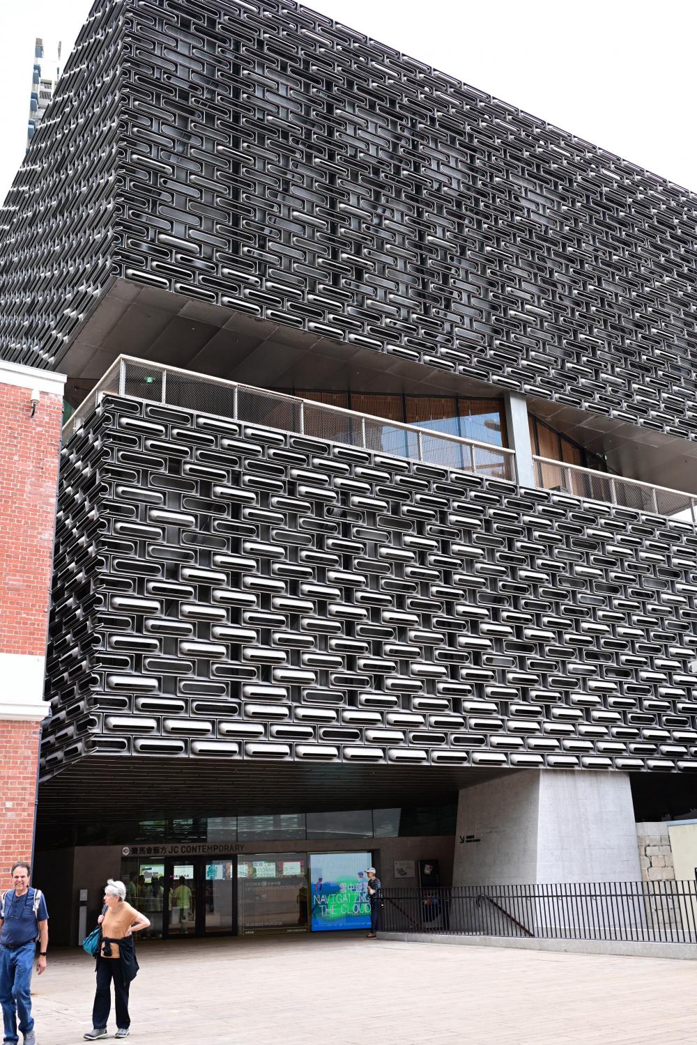 赛马会立方的外观采用黑色金属编织纹理设计,极具现代感,与大馆的历史建筑形成强烈视觉对比。这里是大馆的多功能艺术空间,用于举办戏剧、舞蹈、音乐等各类表演艺术活动,同时也会开展艺术展览和公共文化项目。