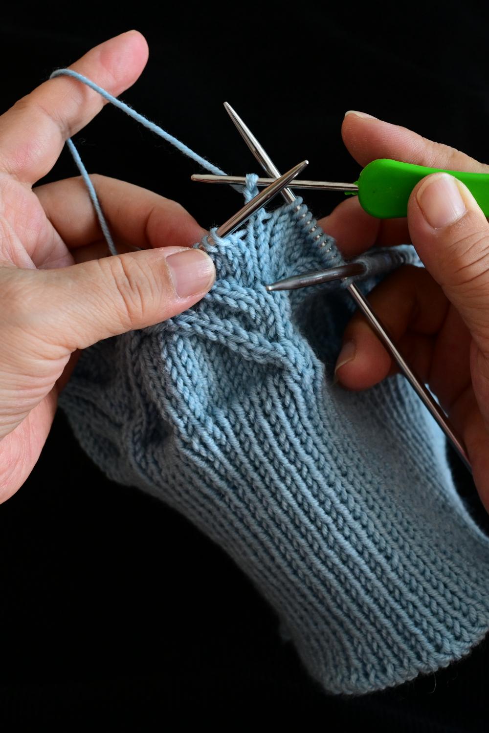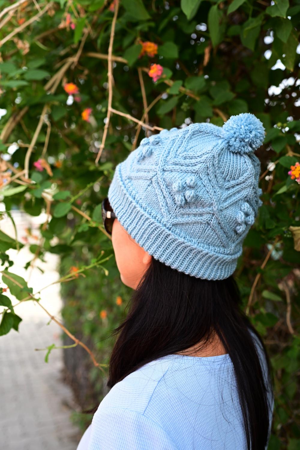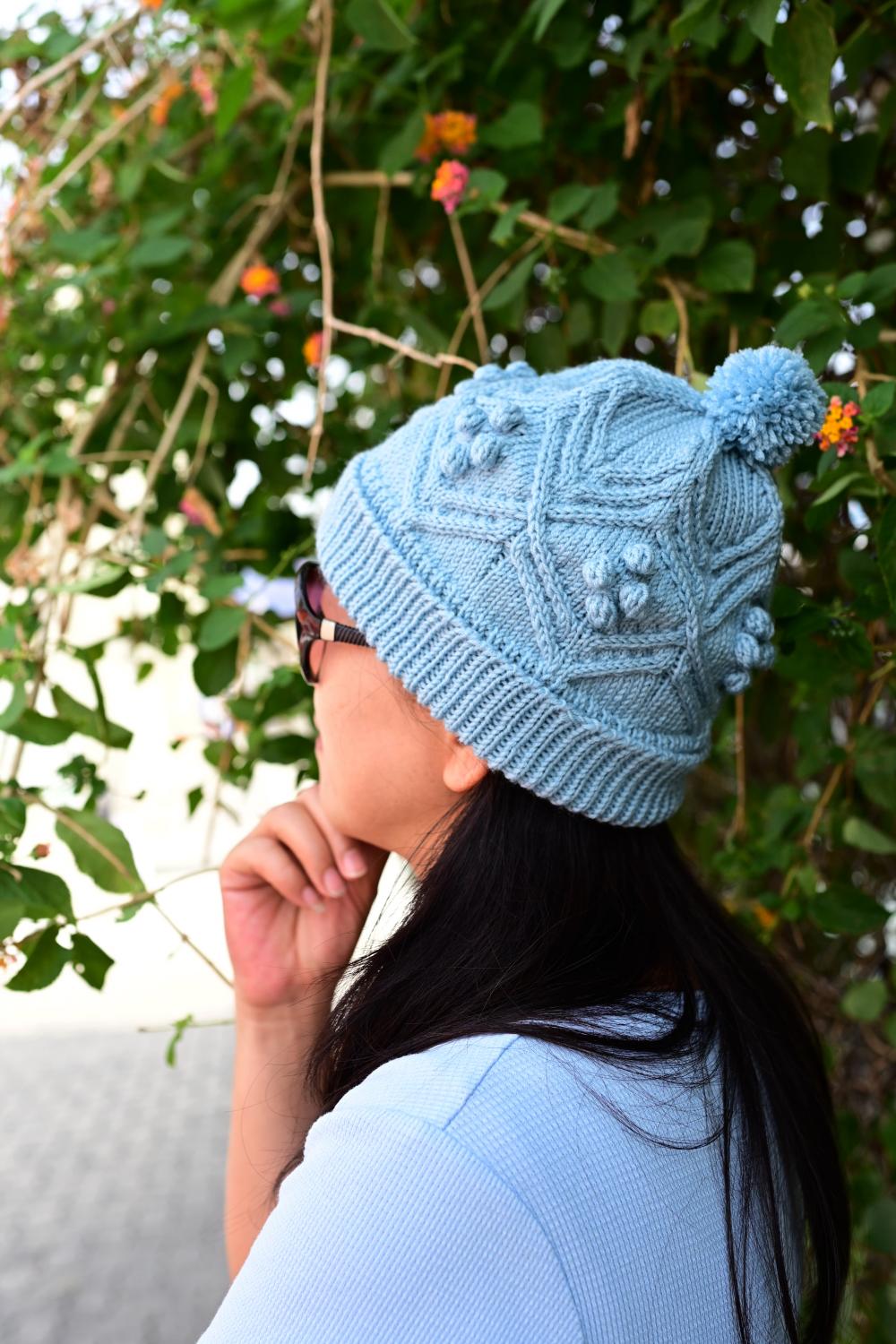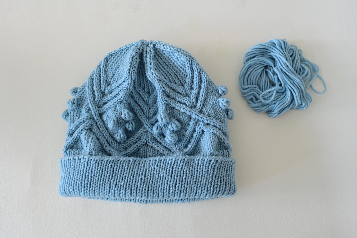 换莫兰迪6#澳洲美利奴羊毛线,奶蓝色,再来钩织一顶同款,还是棒针与钩针打配合。