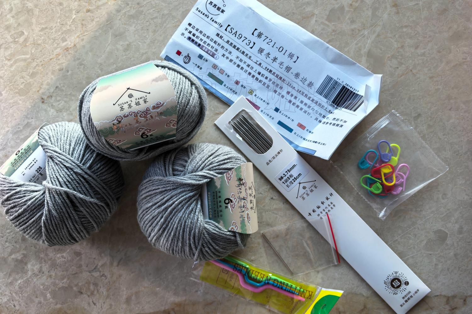 收到的材料包,如下图,基本齐全,只差一根钩针。
