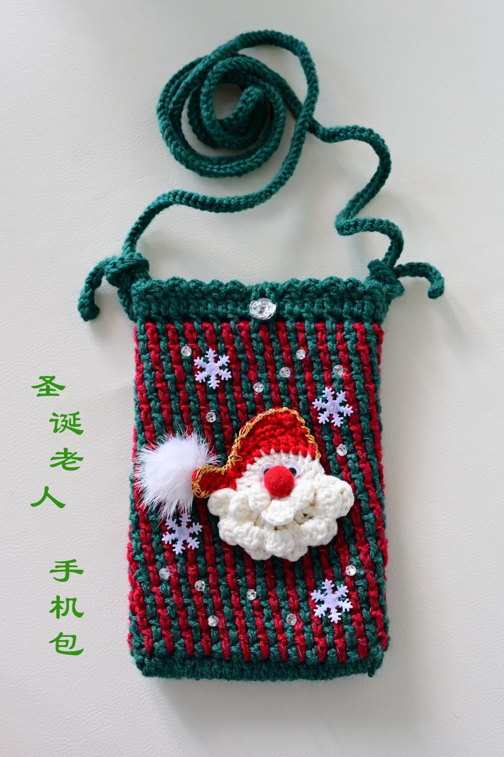 先完成的是手机包,圣诞老人款,主体由两种颜色的线材交替进行,圣诞老人也是勾出来的,雪花和钻是现成的,粘上去就好。