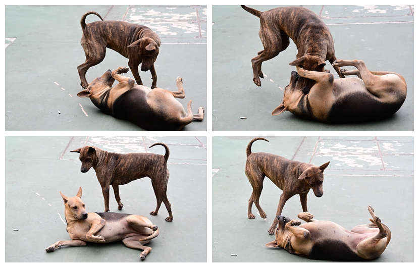 两只不知是在打架还是在玩耍的野狗,一边闹一边叫,也不知是在忙活啥。