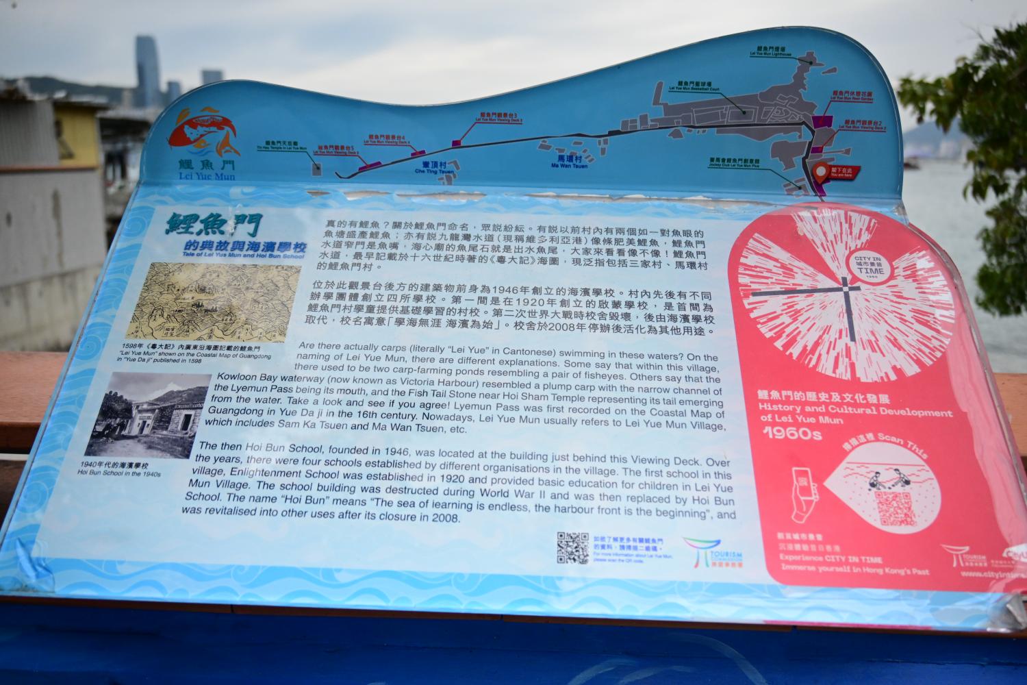 海边,有标牌,写着鲤鱼门的历史与文化发展。