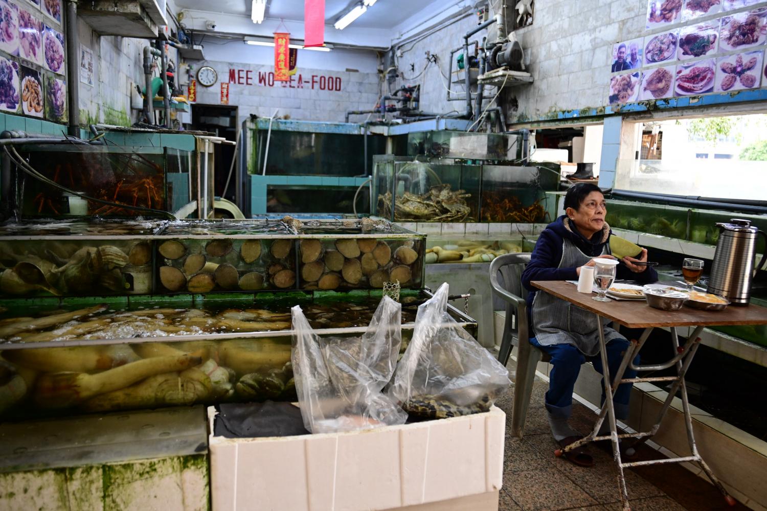 老板娘正在吃饭,指挥老板去称好了海鲜。