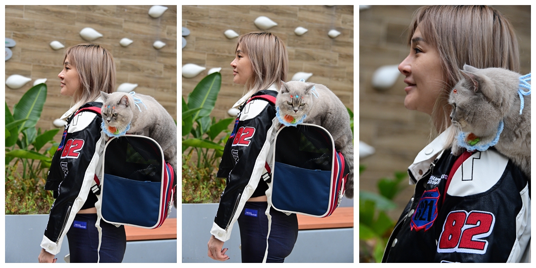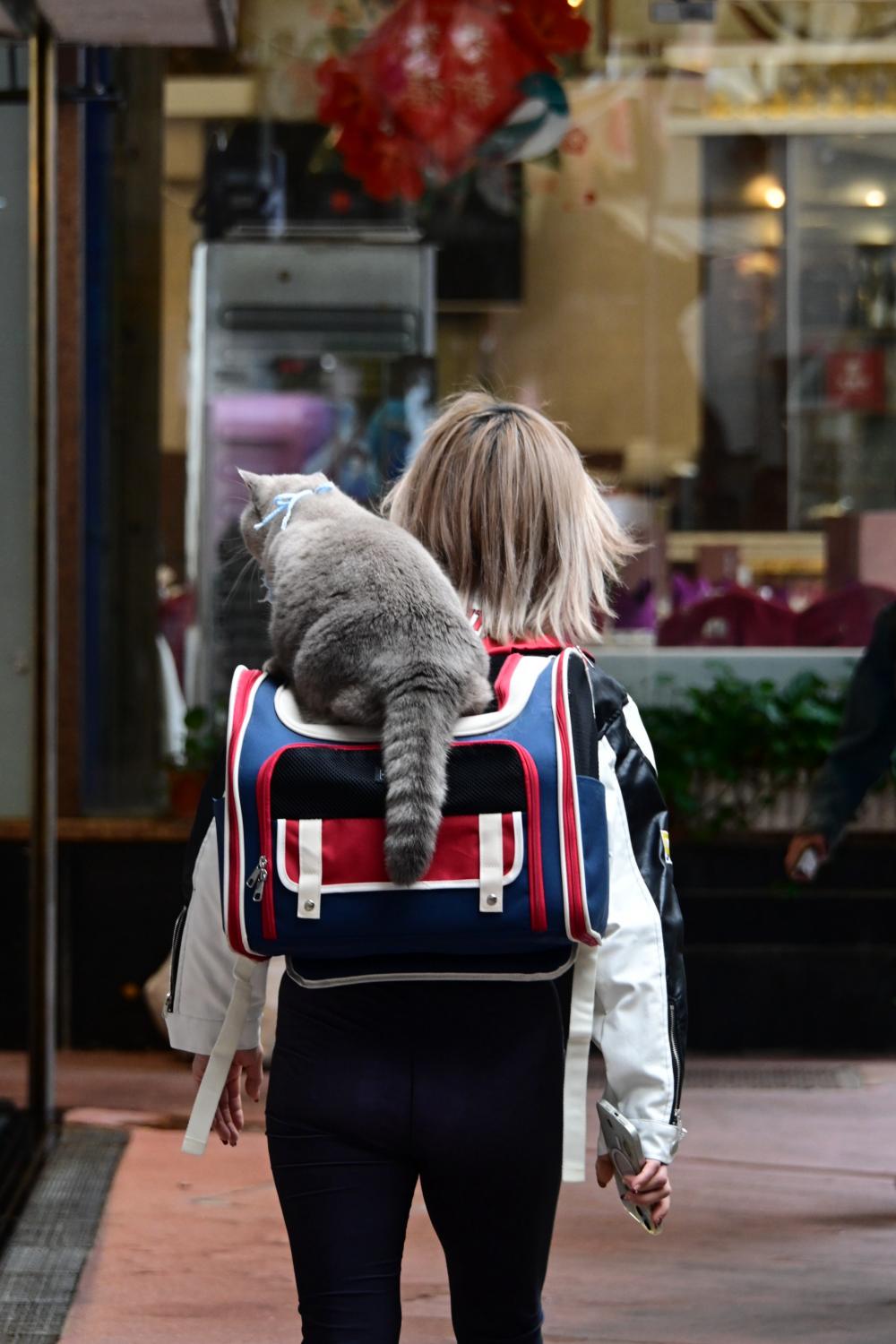 在征得女孩同意的情况下,拍了拍肩头的那只猫。感觉背着这只胖猫,走起路来并不轻松,但女孩却一直面带微笑,对得起这街头或村中一景。