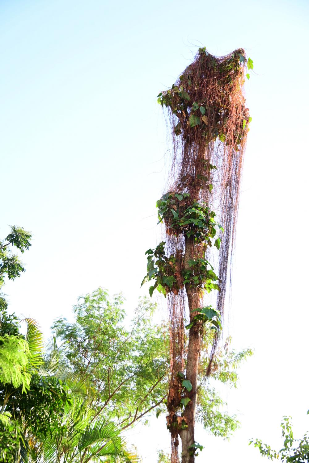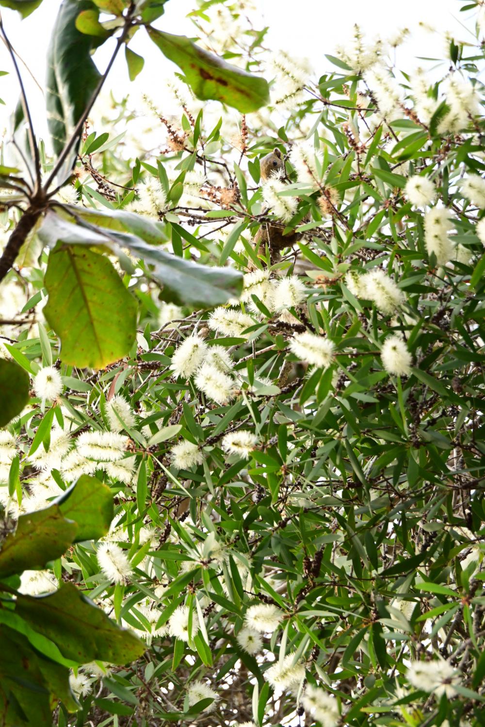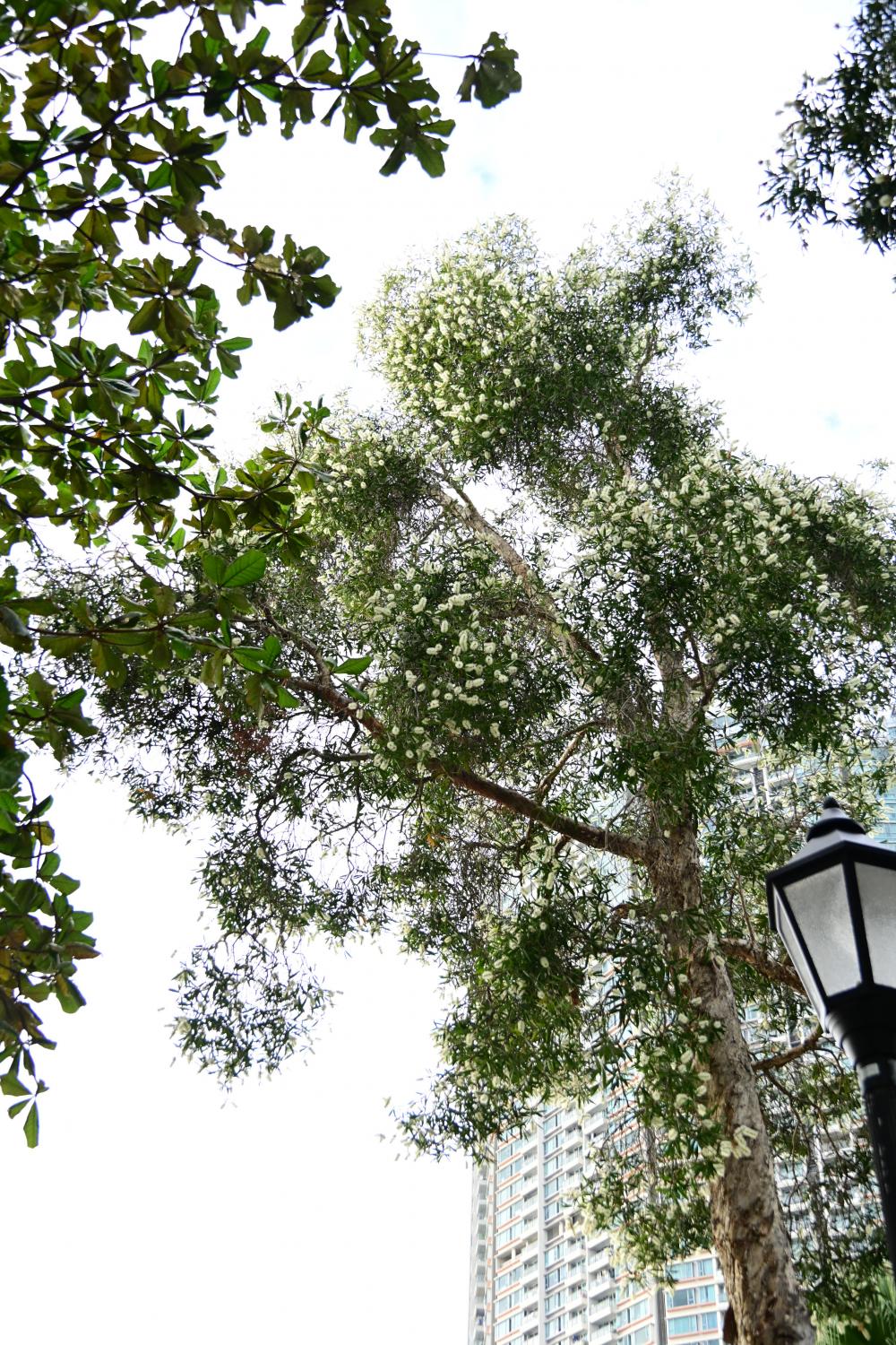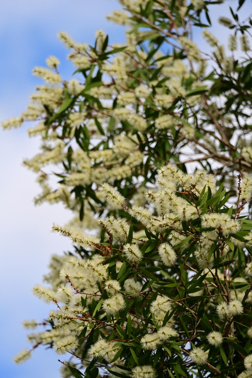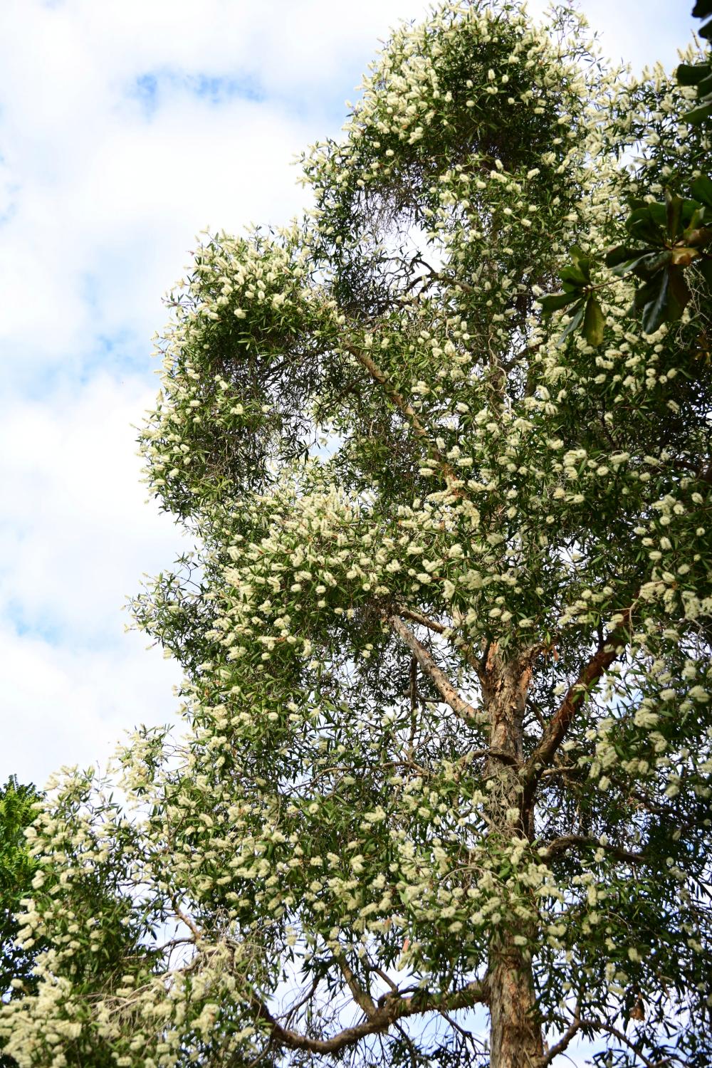 看到挨着的几棵白千层树,顶着满枝的白色花儿。白千层的树皮呈灰白色,常以薄片状剥落,所以得名。